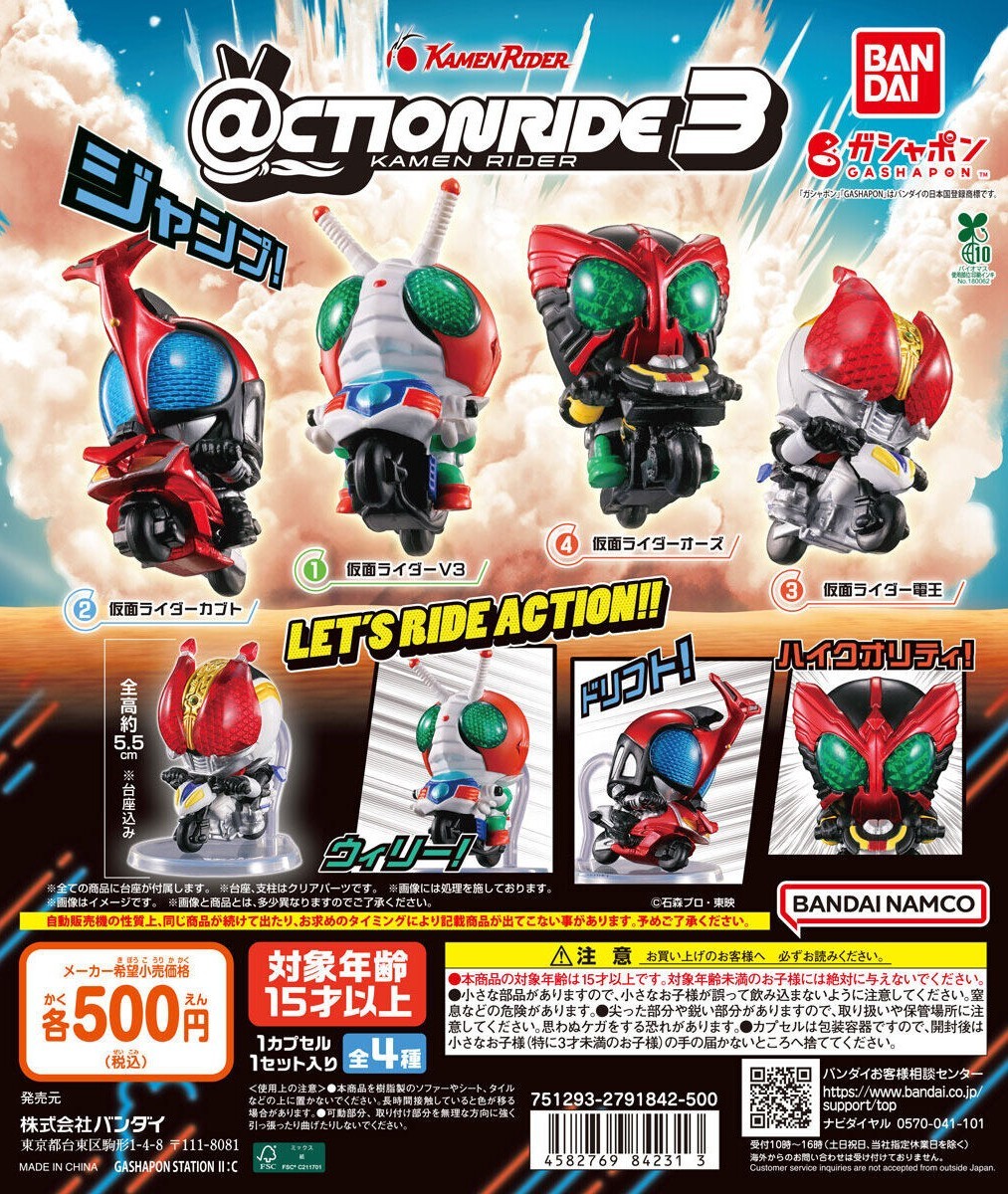 日本萬代轉蛋事業部 GASHAPON 發表了《假面騎士》主題的最新「@CTION RIDE」系列,繼「@CTION RIDE 假面騎士」後,再度發表了人氣第三彈「@CTION RIDE 假面騎士3」轉蛋!一共有四種款式,參考售價為一轉 500 日圓,預計將於 2025 年 08 月開轉。