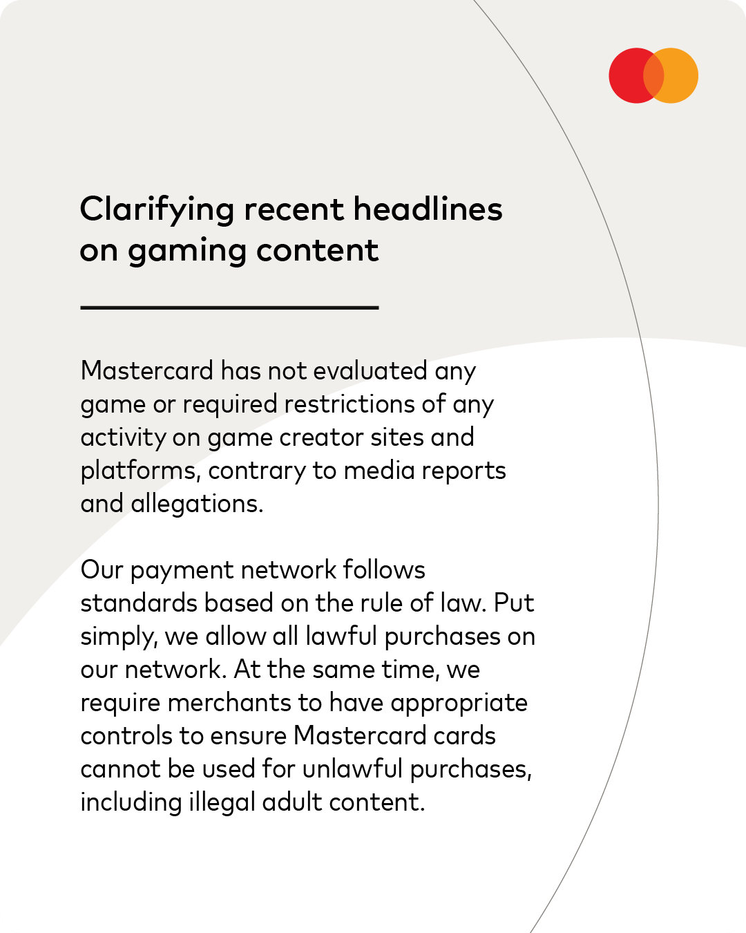 面對外界質疑,萬事達卡起初否認參與決策,聲稱「未限制如 Steam 和 Itch 等平台的任何創作活動」。但 Valve 隨後在回應《Kotaku》採訪時明確指出,支付處理商向他們轉達萬事達卡的規定,要求移除任何可能對品牌形象構成風險的內容,並引用萬事達卡旗下《規則第5.12.7條》。