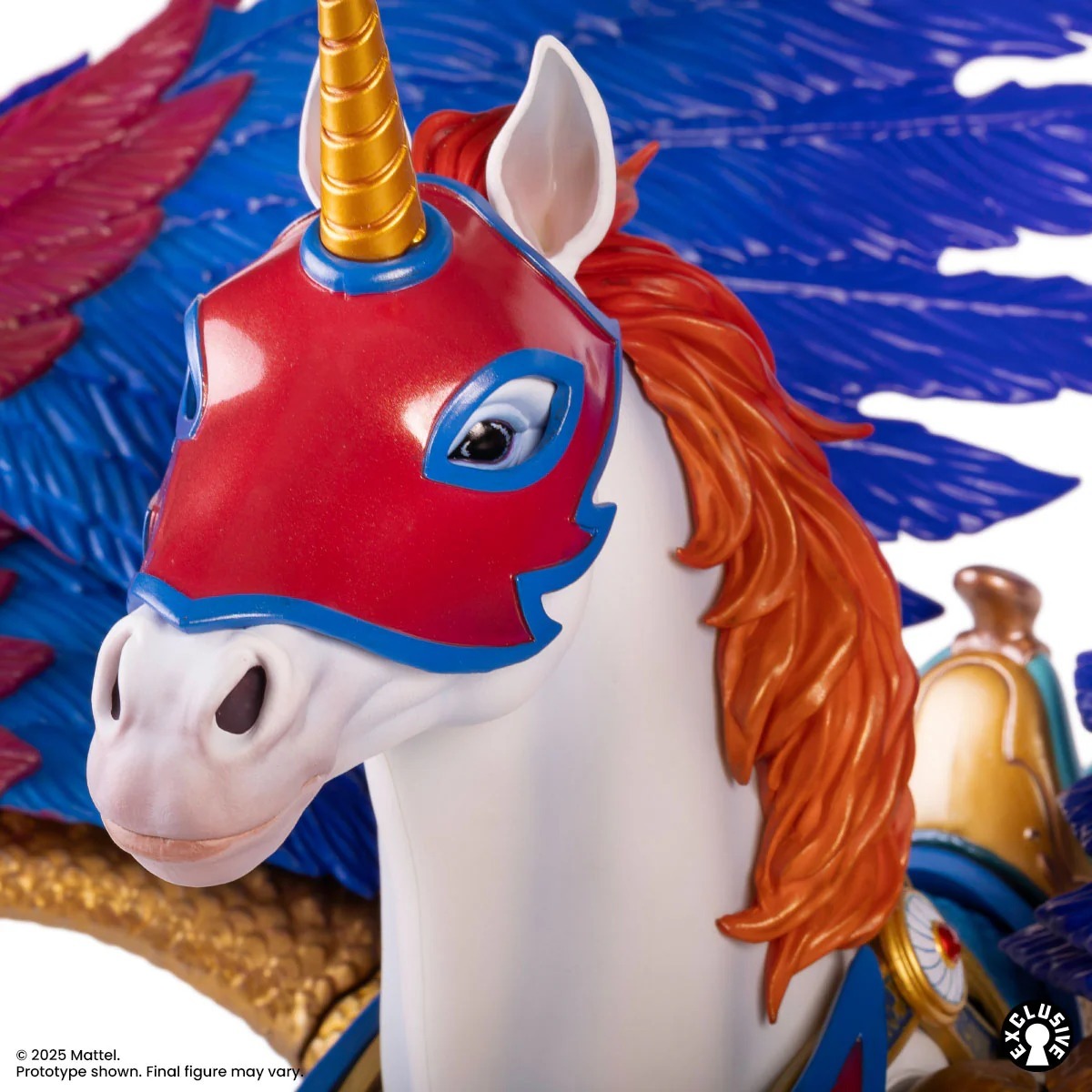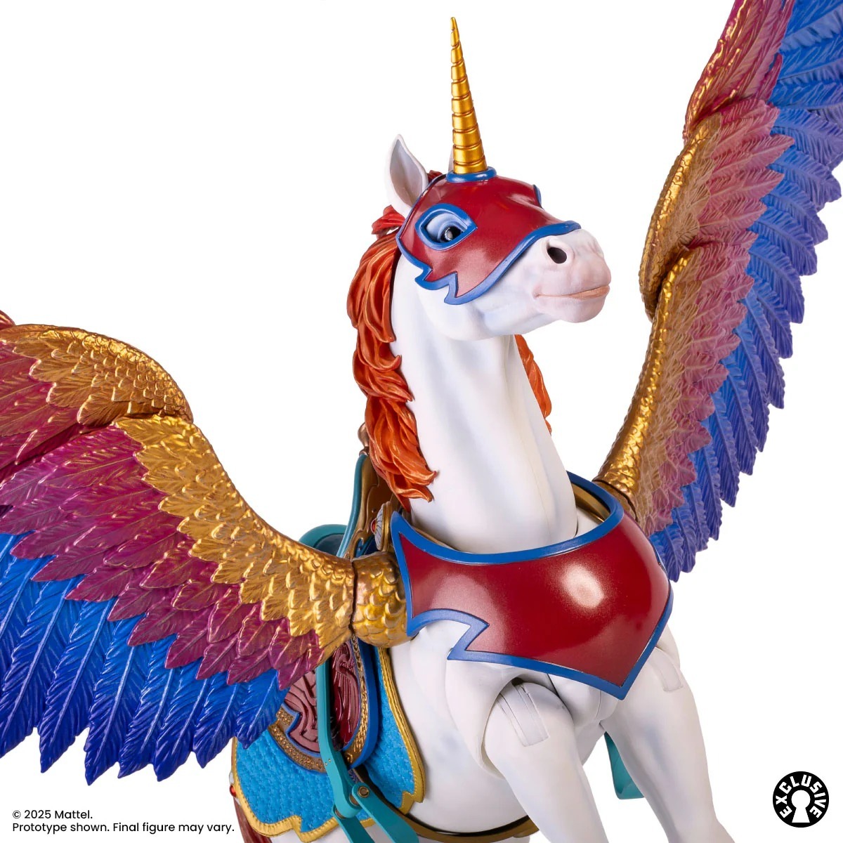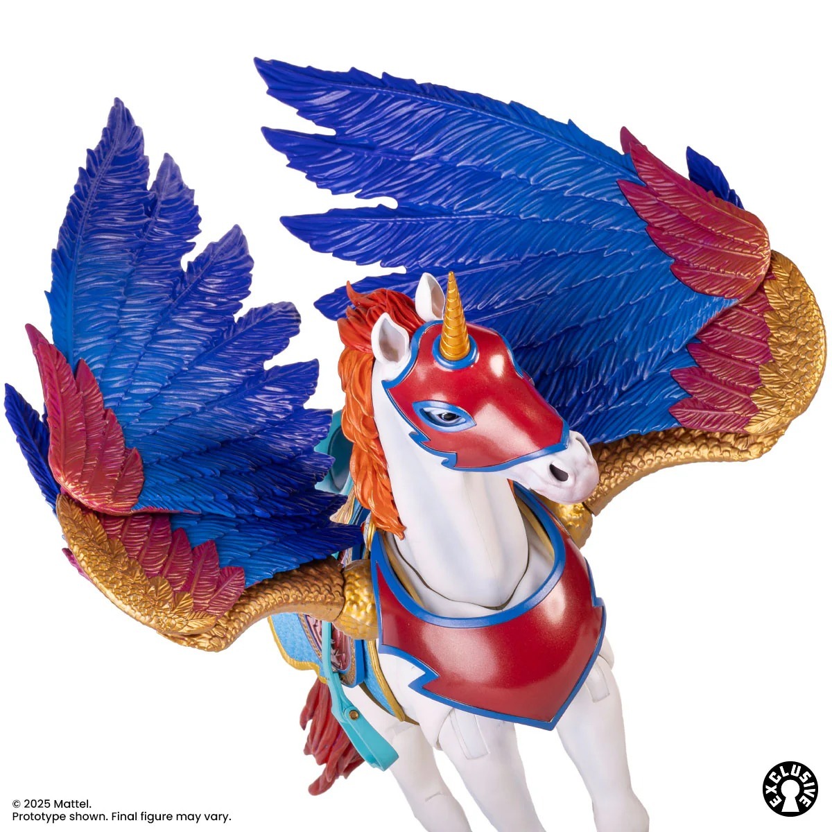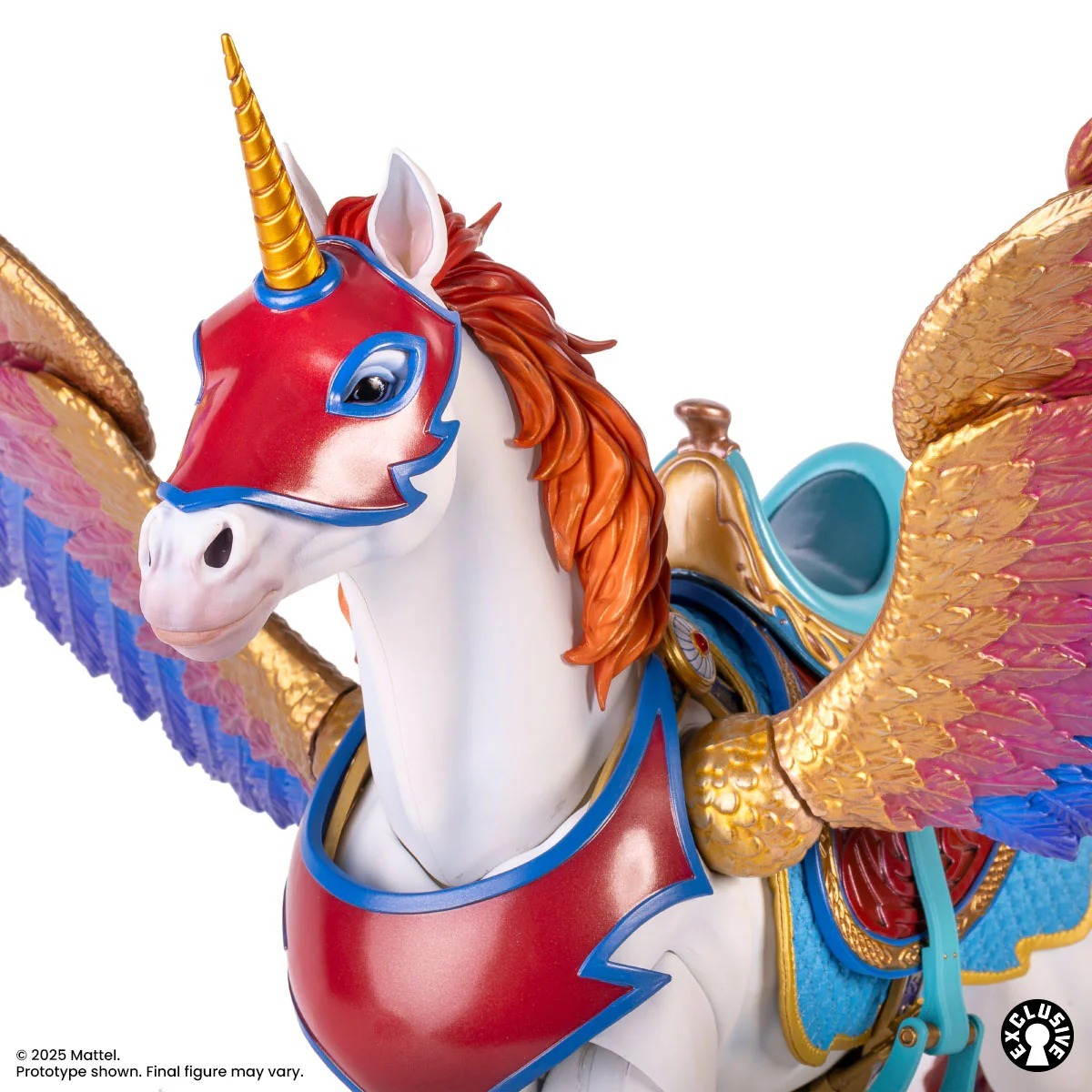 而神力女超人心愛的朋友凌雲飛馬的部分本體高約 38.1 公分,翼展更是來到驚人的 137.1 公分(54 吋),雕刻精緻的再現凌雲飛馬的肌肉紋理與造型細節,翅膀採用可拆式設計,配件附有戴面具的替換頭雕、韁繩、布製馬鞍、胸甲、腿部護甲、馬鞍固定帶等,限時版更收錄了凌雲飛馬小時候模樣的角色模型、經典面具頭雕、胸甲以及神娃公主的另一位好夥伴 Loo-Kee 的角色模型,可以搭配先前推出的多款太空超人主題 1/6 比例可動人偶擺設重現各種劇中的場面!
