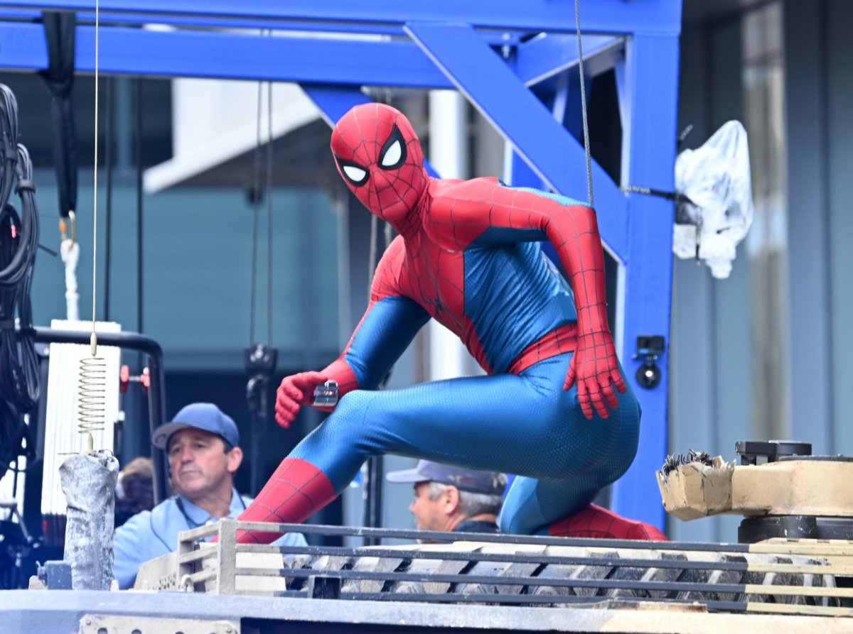 在蘇格蘭拍攝的《蜘蛛人:重生日》近日暫停製作,但片場照搶先曝光。霍蘭德的新面罩不再依賴 CG 特效,而是配有一層包覆下顎的內層裝置,能讓面罩隨嘴部動作而起伏,實現更自然的表情同步效果。