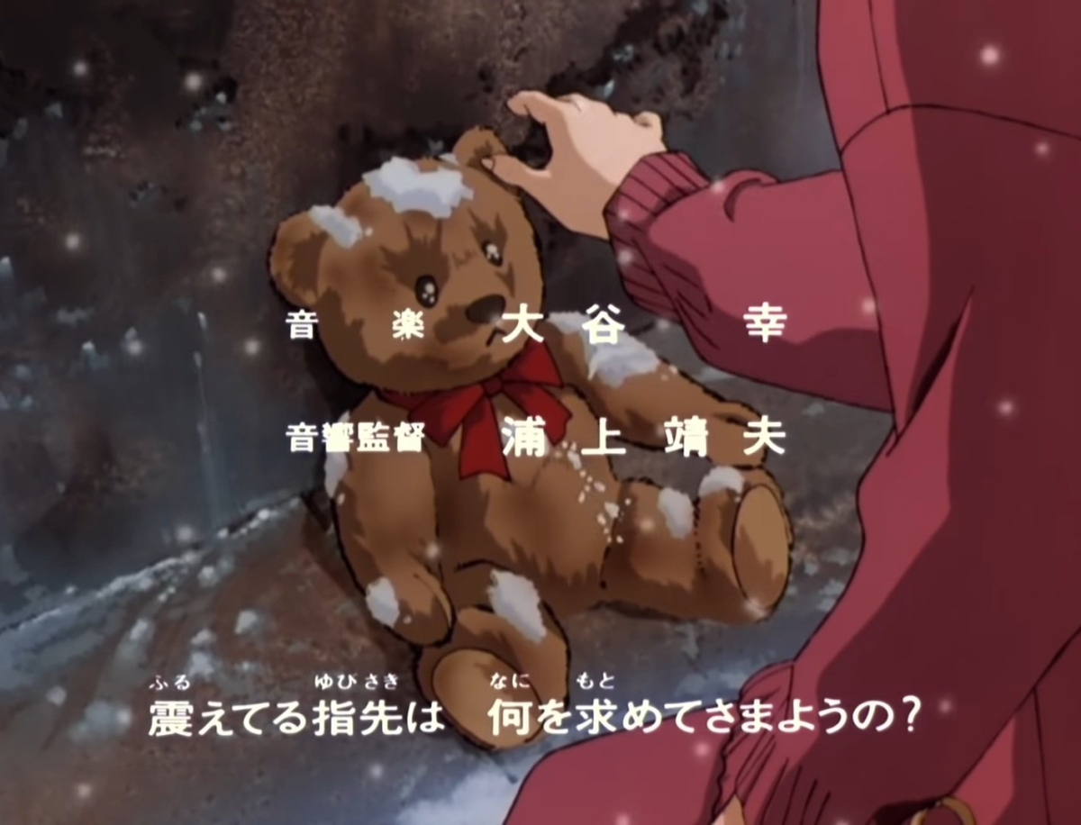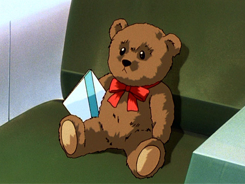 相信各位如果還有印象,這隻小熊出現在動畫 OP1 中,莉莉娜用手輕輕擦去上面的雪的場景。當然劇情中就是希洛扮成工作人員,偷偷放生日卡和小熊在飛機位置上,結果被莉莉娜發現後當場把卡片撕掉,回敬當初希洛當初撕爛她的生日派對邀請函 XD。