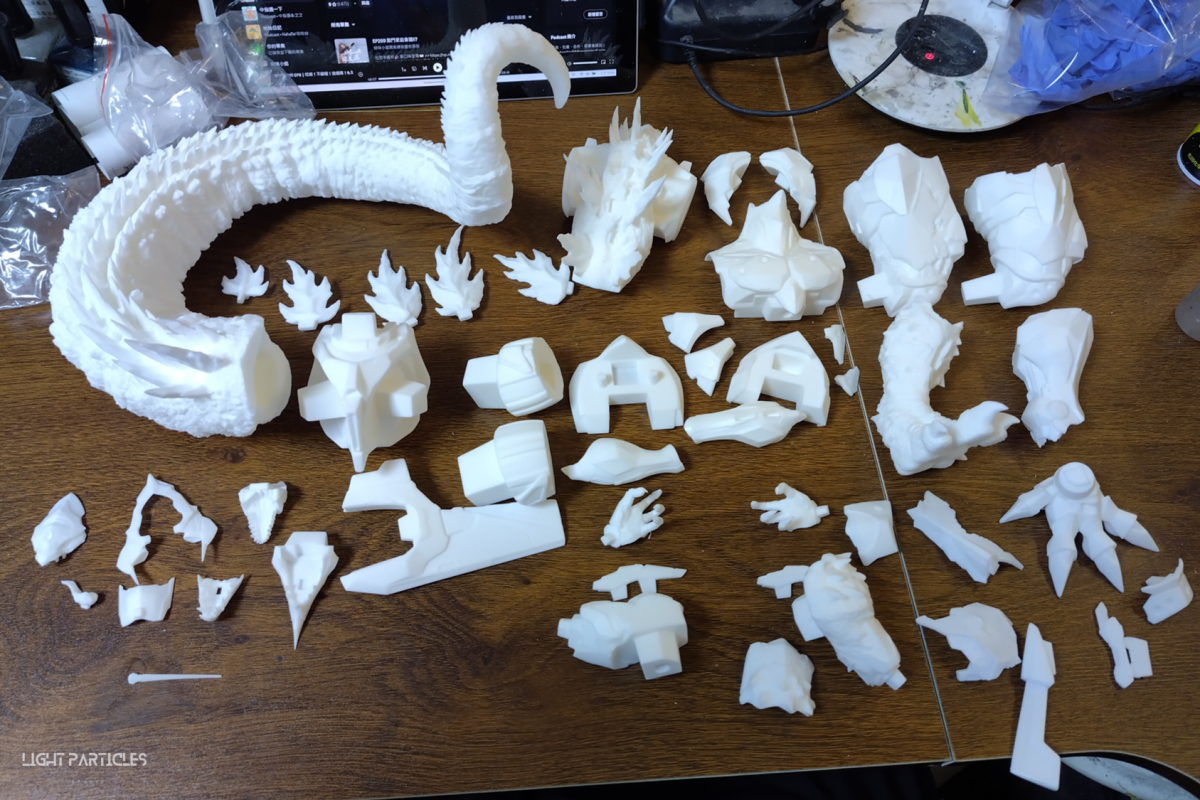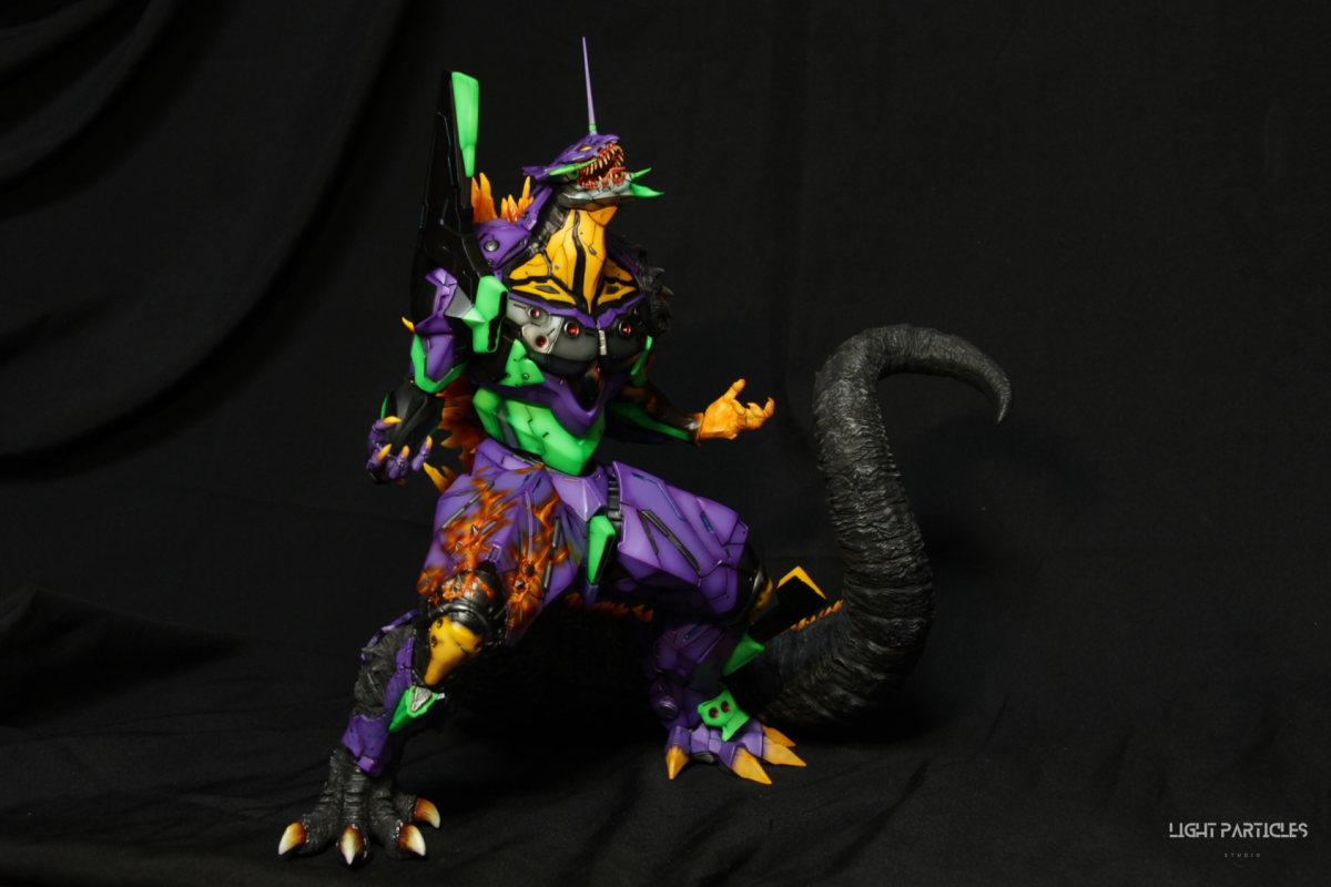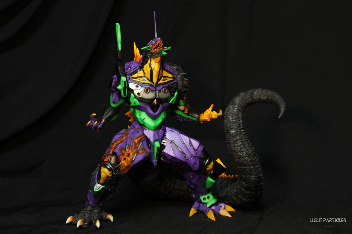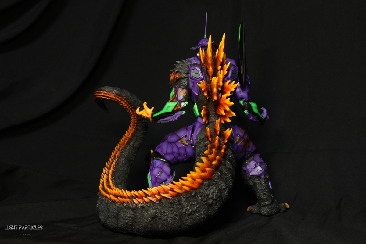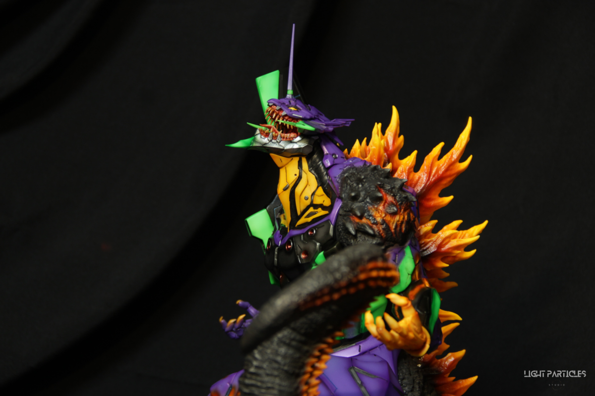 距離上次製作相同套件大概4個月前,本次製作是客戶委託。需求要將哥吉拉生物部分上色成紅蓮哥吉拉的樣式。製作重點以紅蓮哥吉拉顏色為主並配合調整初號機本體色彩。利用套件左手臂裝甲裂痕以及左手掌,將顏色設計成火焰掌並把裂甲凹陷處塗成從體內燃燒出來的效果,手掌往手臂銜接以亮黃漸層至暗紅作出層次感。配合紅蓮高度燃燒效果,初號機的機械部位則加強各區塊的立體感,墨線以及陰影都選擇較強烈顏色處理。嘴巴部位也使用更多顏色做出生物感,哥吉拉暗色皮膚以更多乾掃以及漬洗把立體做出來。很開心客戶提供的點子,製作起來的成果也有不一樣的感受,希望大家喜歡~