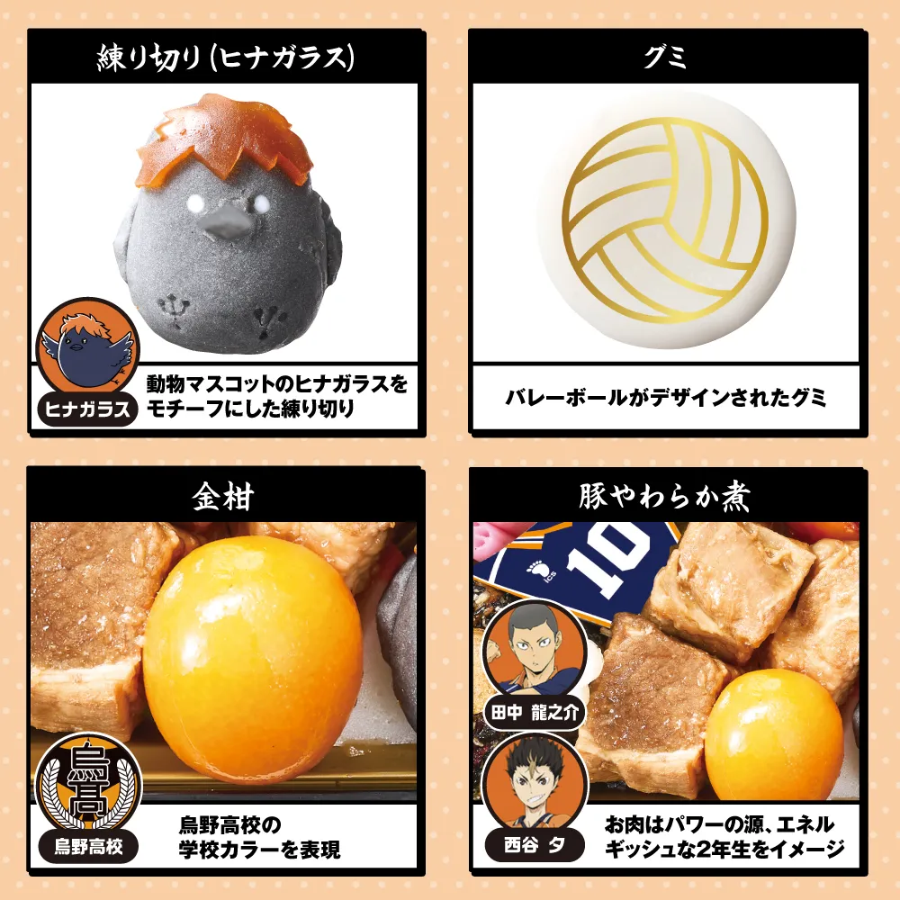 除了各校地區的名產、角色喜歡的食物,還有像排球造型的軟糖、練切造型角色甜點等,細節配色也都有用上。