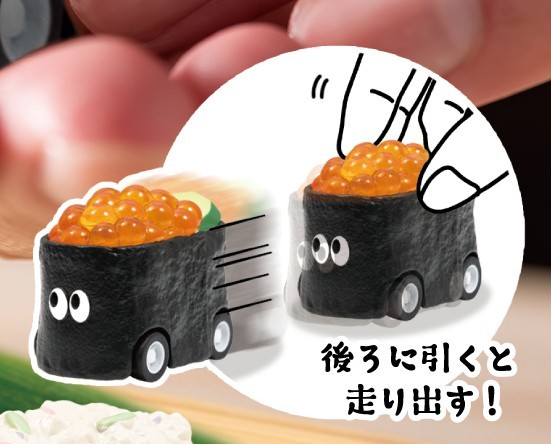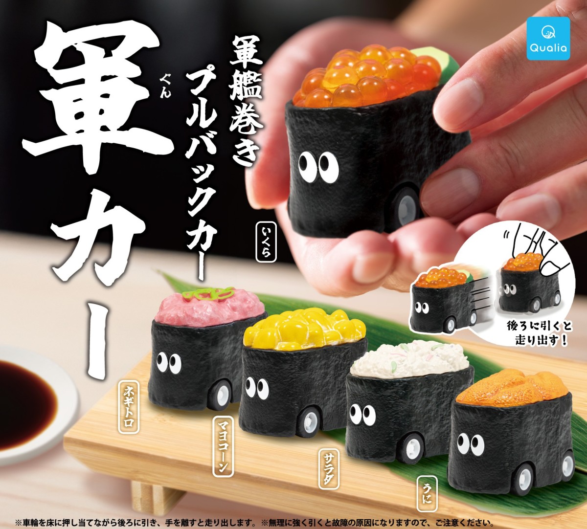 Qualia「軍艦造型迴力車 軍車」轉蛋,將軍艦壽司結合小小迴力車,除了美味的餡料之外還有逼真質感的海苔,更重要的是,還設計有可愛又迷人的小眼睛!讓整體更加活靈活現~陣容有:鮭魚卵、蔥鮪魚肚泥、(到底都是誰在點的)玉米、沙拉以及海膽~將小車輪壓在地面上向後拉,鬆開即可展開始壽司們的美味大對抗?!