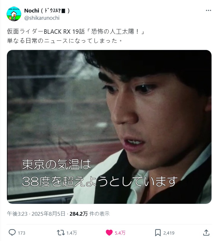 近日日本 X 上,有推主翻出過去特攝作品《假面騎士BLACK RX》中,其中一話提到「人工太陽」時,指出東京氣溫超過 38 度的恐怖襲擊,直呼這個夏天根本天天都是這個現象。這個考古也引起網民關注,開玩笑說現在是有怪人入侵。