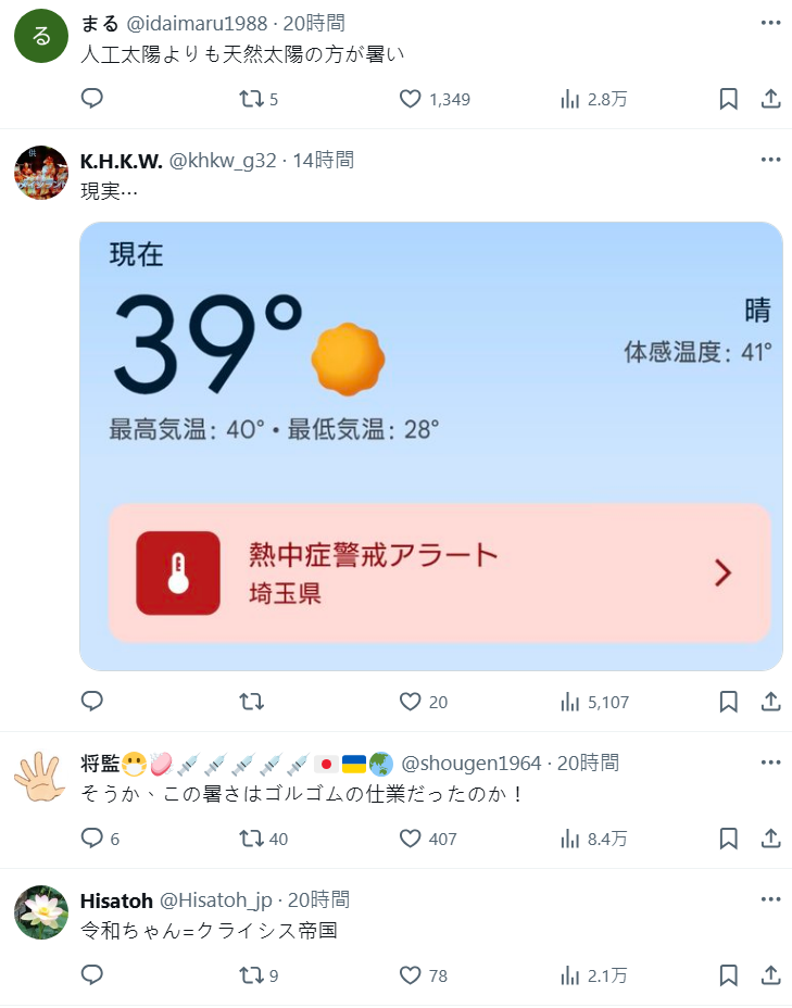 現在日本氣候酷熱,甚至體感溫度還飆破 40 度,網友也直呼天然太陽更熱啊...,現在根本就是黑暗結社戈爾哥姆(ゴルゴム)跟克萊西斯帝國在作祟吧 !
