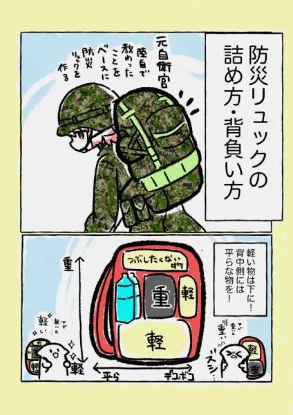 如果背包很重要怎麼背呢?シナモン建議:「可以先躺下,手伸進肩帶,然後像滾地瓜一樣滾過去讓背包自然背上來」。另外選擇有腰帶的背包,把肩帶拉緊、包包貼近身體,也能大大減輕負擔。他也表示大家日常或是遇到災害時份量應該不至於像過去自衛隊背裝備更重,應該都可以用這些小技巧來幫助自己。