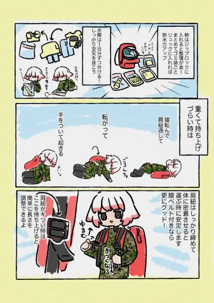 近日日本 X 上,一位曾任日本陸上自衛隊、現在以 Vtuber 身分活動的 シナモン (@CNMNSN),就透過 X 發表了一篇自繪漫畫,分享 「背包該怎麼打包、怎麼背才不會累」的小提點,引起網友熱烈回響。