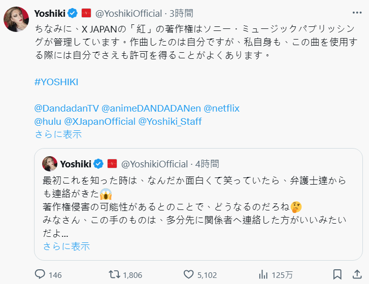 YOSHIKI 也提醒,X JAPAN 的「紅 ( Kurenai )」這首歌的版權是由 Sony Music Publishing 管理的。雖然是自己作的曲,但其實就連本人在使用這首歌的時候,也常常得先去申請授權。
