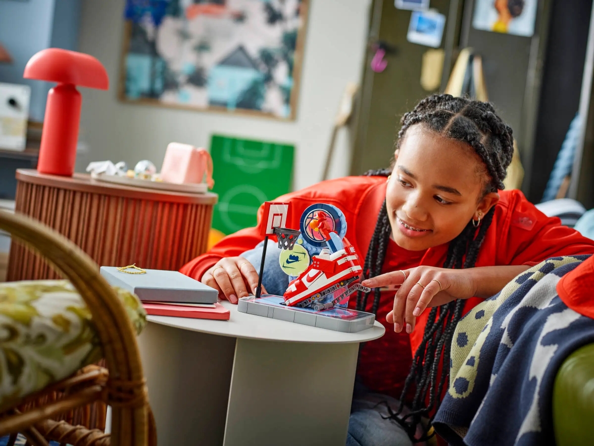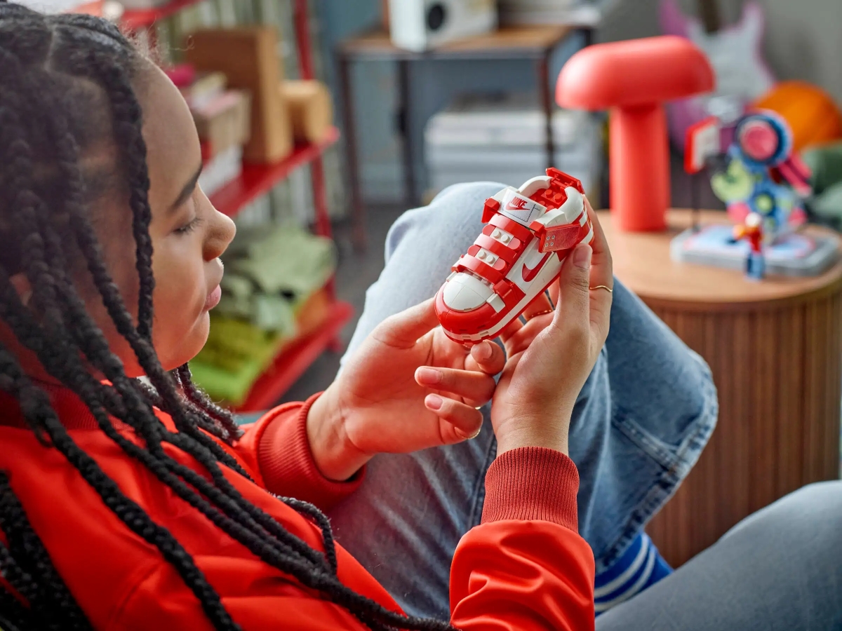 紅白配色的低筒 Nike Dunk 球鞋拆下來之後非常適合單獨展示,拿在手中把玩的視覺效果同樣相當不錯!身穿紅色運動帽T 的人偶超級值得收藏啊~球場風格場景也很有意思,包含厚實的底座、籃球架、籃框,以及包含大大小小的圓點與增添灌籃速度感線條的背景板,搭配塗鴉風格的籃球、Nike × LEGO 圖案,為整體注入帥氣的運動潮流元素,必須買啊!