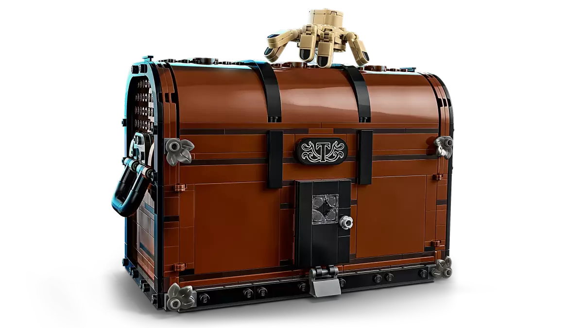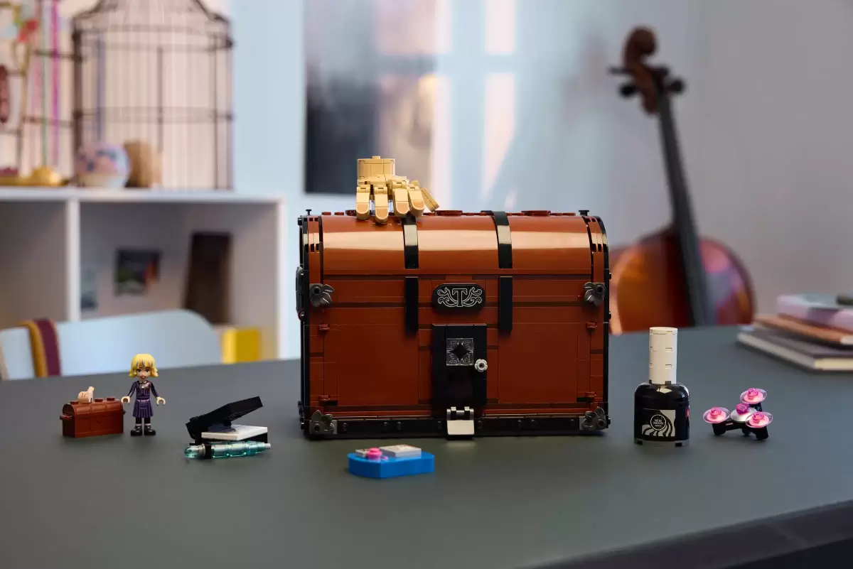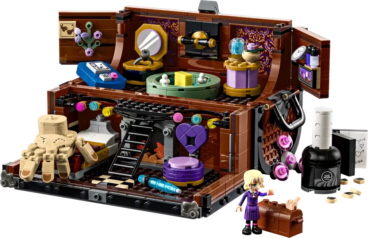 本作一共 828 片零件,組完之後可以得到一個長 23 公分、外觀造型完整且可以展開的旅行箱模型。打開之後是一座兩層樓結構的場景,其中包含床鋪、椅子、黑色指甲油、護手霜,以及一個磚拼形式的「小手」,可以抓著小手把玩淋浴機構、打遊戲、換零件重現塗上黑色指甲油的樣貌,超有意思;另外,這款盒組還附上了一個 LEGO Friends 系列的依妮·辛克萊(Enid Sinclair)人偶、迷你人偶規格的小手跟作為縮小版提箱的寶箱零件。