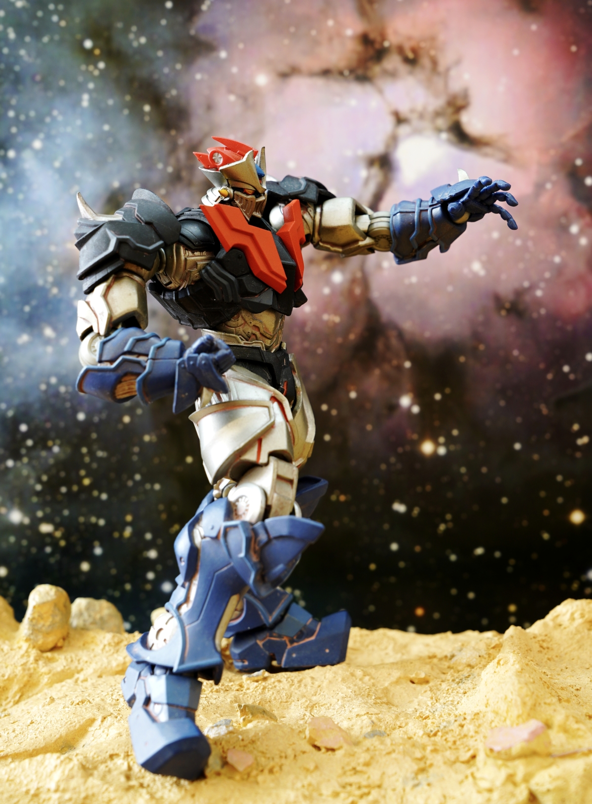主體高約 18cm,外型非常霸!整體感覺是類似美玩的素體,所有尖角位都是軟膠製,所以把玩時十分安全。雖然只是港幣 300 元左右,但他依然包括了特效件,飛拳台坐等提升玩味的點子!而最驚喜的事他的面罩是可脫的,把玩時的感覺和美玩相近。全身有塗裝之餘亦有一定程度的舊化,可動性不俗。老實說,這個價錢有這個質素真的沒有什麼話可說!喜歡玩玩具或鐵甲萬能俠的朋友真的不要錯過!