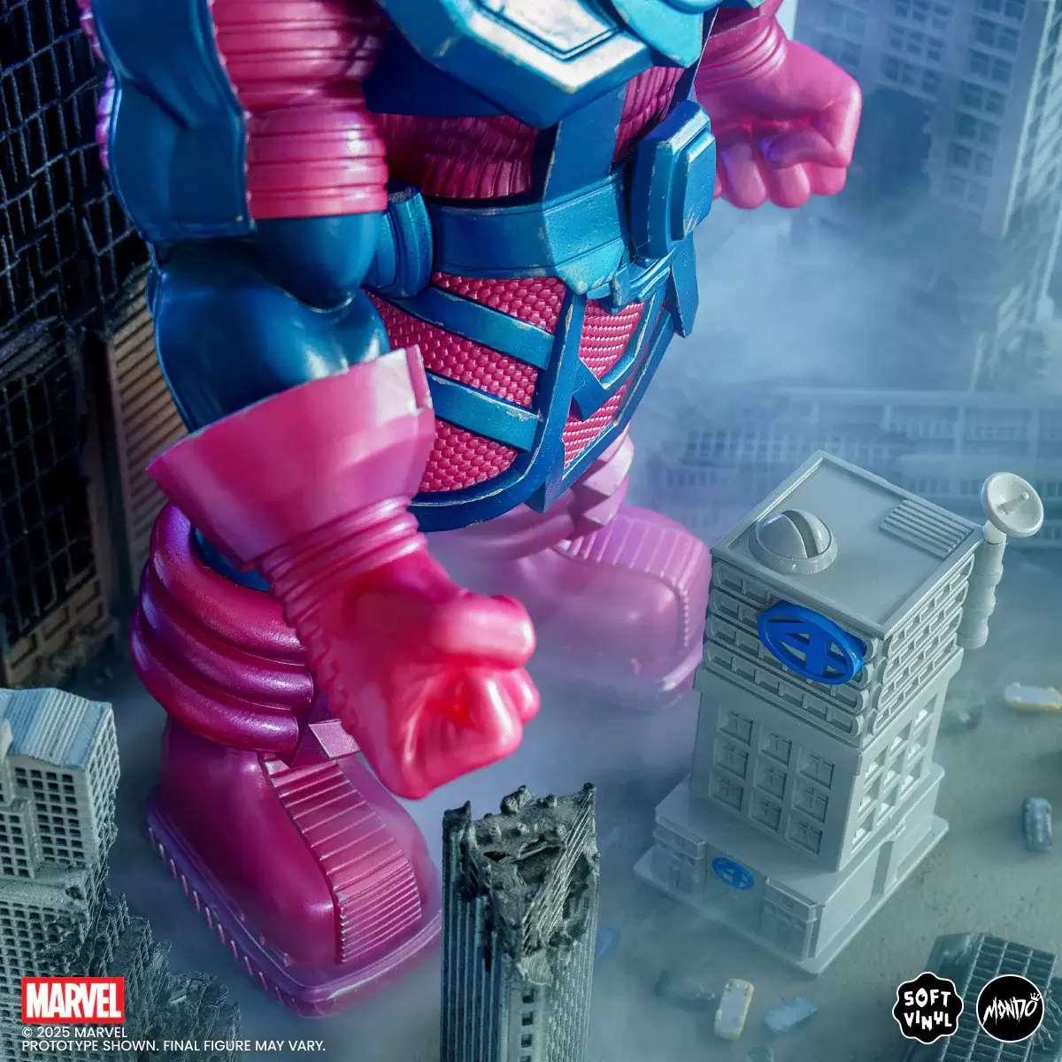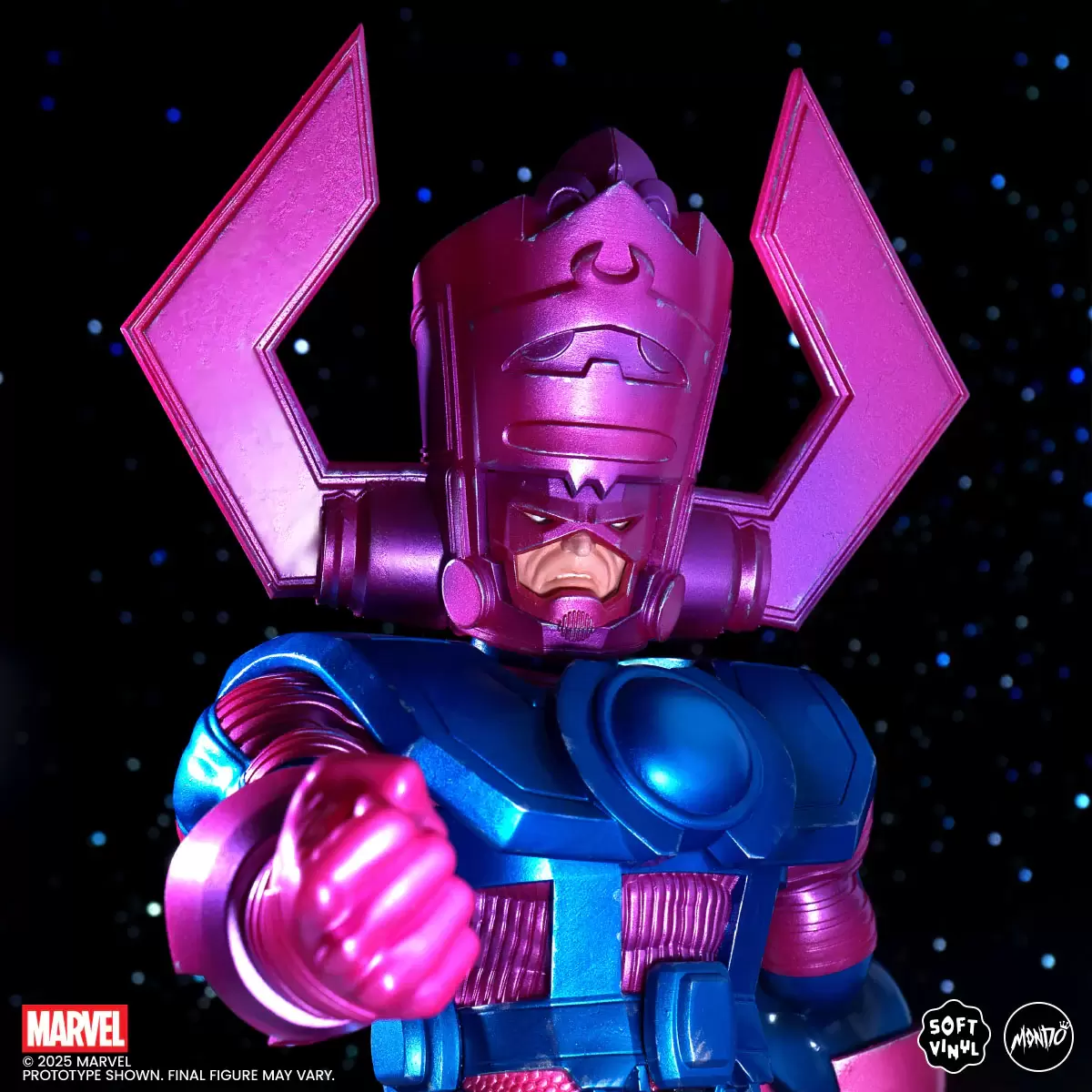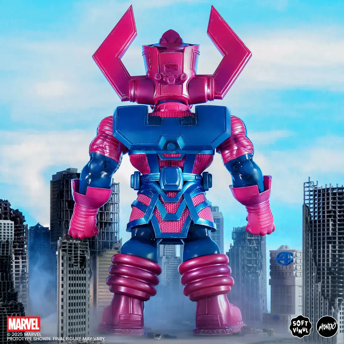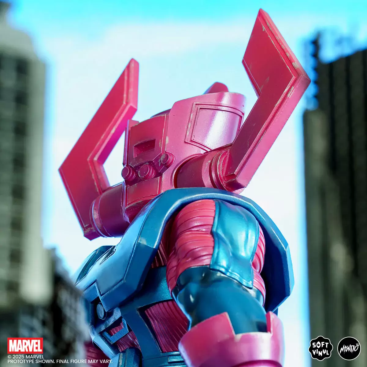 作為 MONDO 漫威軟膠人偶(Marvel Soft Vinyl)產品線當中的最大級作品,這款行星吞噬者高約 38 公分,整體設計是由知名藝術家 James Groman 操刀,造型則是由 Darrel Raymundo 負責雕刻,充分再現了行星吞噬者的經典頭盔與覆蓋著藍色、桃紅色裝甲的樣貌,壯碩的肌肉線條也細膩形塑,超讚的是,本作還附上了替換手、宇宙能量特效(Krackle energy effect)、身為使者的銀色衝浪手(Silver Surfer)跟巴氏大樓(Baxter Building)可以一起搭配把玩。