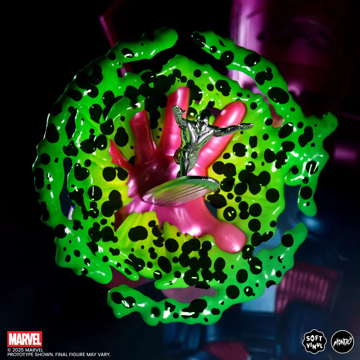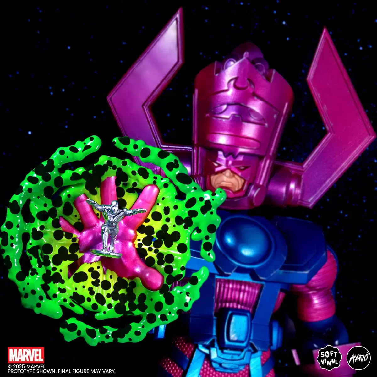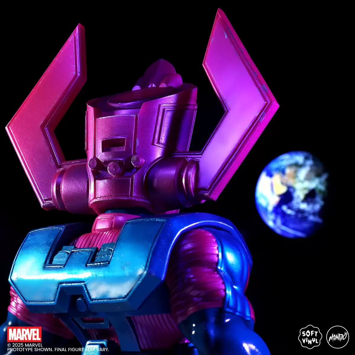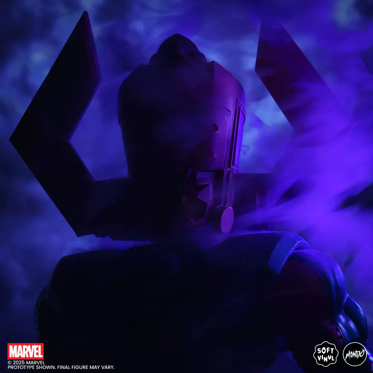 作為 MONDO 漫威軟膠人偶(Marvel Soft Vinyl)產品線當中的最大級作品,這款行星吞噬者高約 38 公分,整體設計是由知名藝術家 James Groman 操刀,造型則是由 Darrel Raymundo 負責雕刻,充分再現了行星吞噬者的經典頭盔與覆蓋著藍色、桃紅色裝甲的樣貌,壯碩的肌肉線條也細膩形塑,超讚的是,本作還附上了替換手、宇宙能量特效(Krackle energy effect)、身為使者的銀色衝浪手(Silver Surfer)跟巴氏大樓(Baxter Building)可以一起搭配把玩。