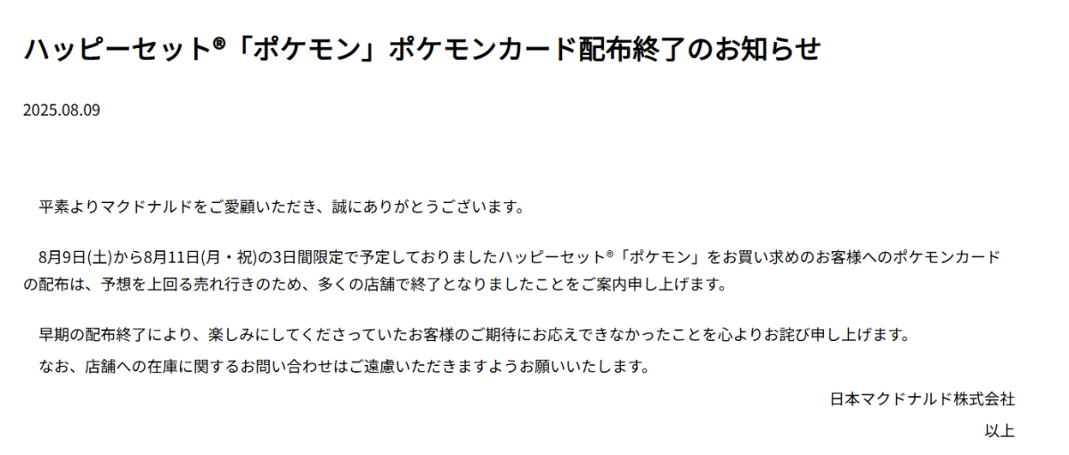更讓人難過的是,原本寶可夢卡牌活動要持續三天,沒想第一天還沒過完,官方就直接公布:「快樂兒童餐『寶可夢』的週末贈品『寶可夢卡牌』,部分店舖已經停止發放。」並呼籲在 8 月 9 日到 11 日這三天,快樂兒童餐「寶可夢」每人限購 5 套。