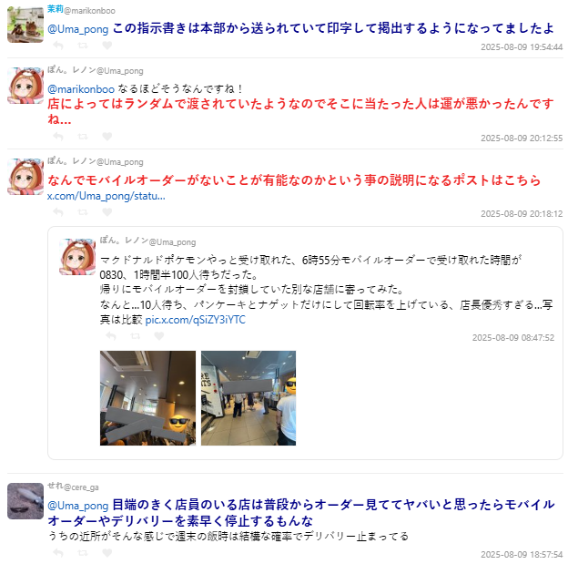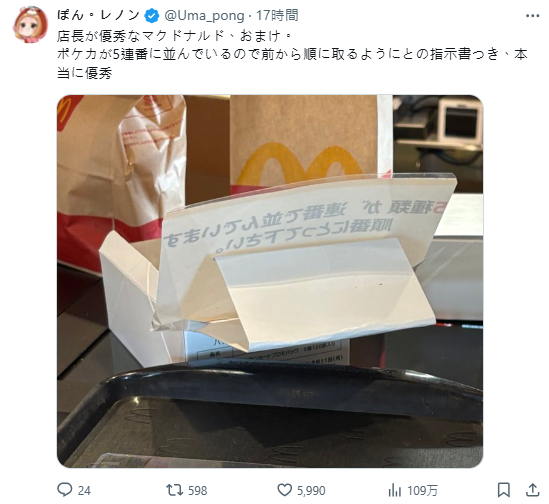 有網友分享,某家「神店長」麥當勞分店在活動期間祭出三大措施:封鎖手機點餐、停售蛋堡、關閉一台自助點餐機,讓現場排隊人數最多僅 10 人,與其他動輒百人長龍的分店形成強烈對比。該店更將寶可夢卡片依序排好,貼上指示讓顧客依號碼順序自行領取,避免混亂。