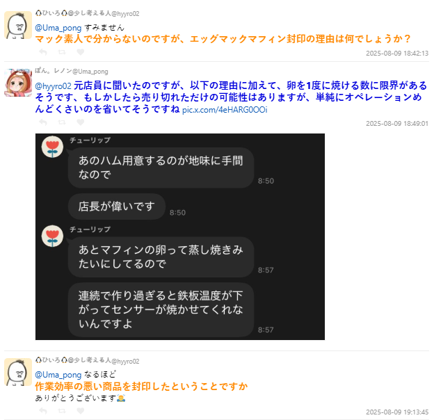 對於停售蛋堡,有前員工解釋,原因包括蛋類煎製數量有限、製作流程繁瑣等,以降低廚房壓力。此外,也有店長選擇將快樂兒童餐跟一般顧客分開販售,或限制只能在櫃檯排隊購買,避免黃牛大量透過手機系統搶貨。
