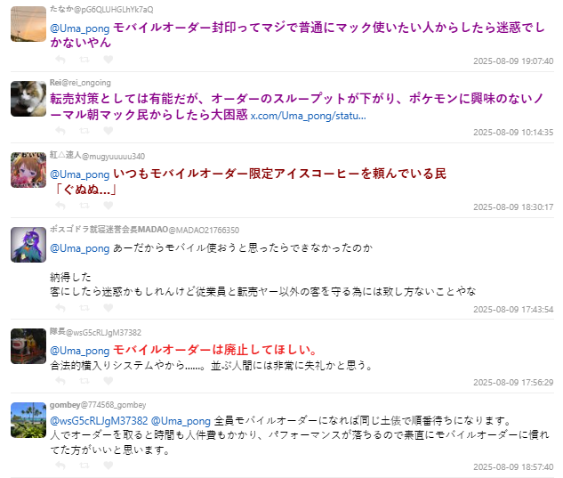 不過,措施並非全數獲得好評。有民眾認為封鎖手機點餐對只想單純用餐的顧客不便,尤其是早晨習慣用手機點咖啡或早餐的常客。有批評聲音直指,麥當勞總公司應直接修改系統,限制單次購買數量或取消黃牛的優勢,才能真正解決亂象。