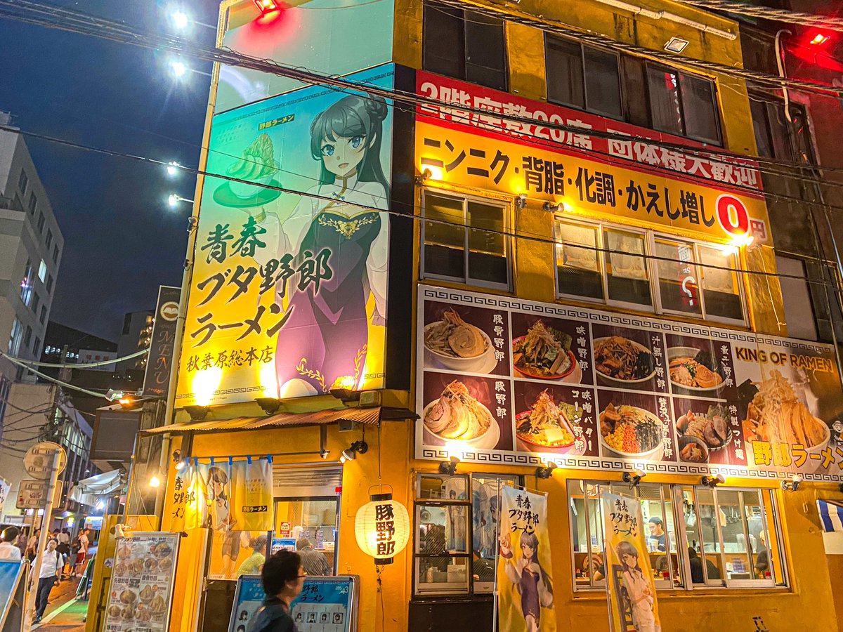 秋葉原店自 2012 年開業,位於俗稱「垃圾街」的中古電器店街區一角,除了本身的豪邁拉麵,也因多次與人氣動漫、遊戲合作推出限定餐點和視覺設計,成為粉絲打卡聖地。
