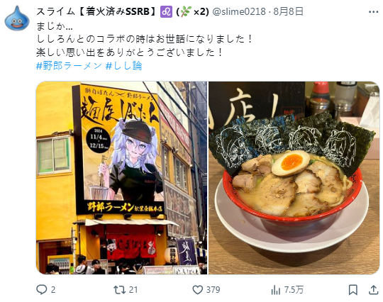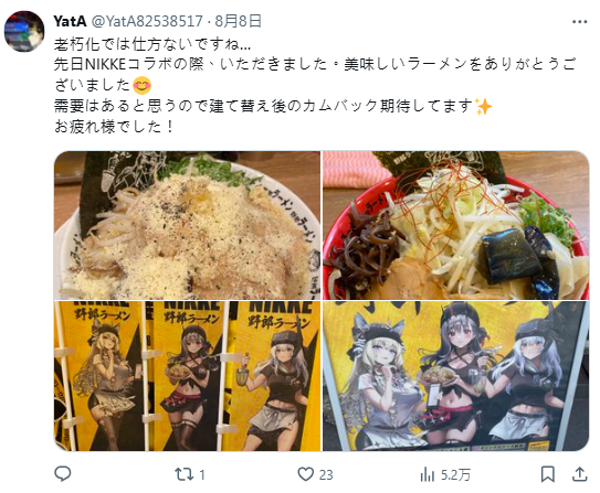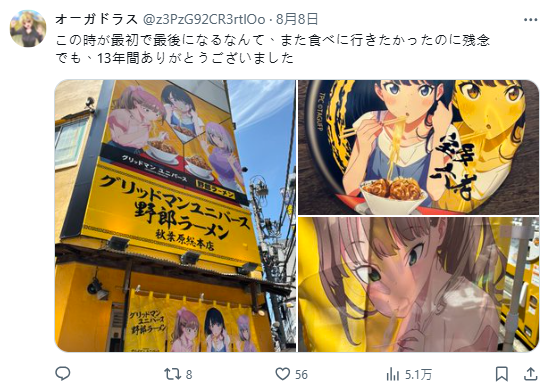 官方在「閉店公告」中寫道:「感謝多年來眾多粉絲的支持,也透過與許多作品的合作活動,和大家創造了滿滿的回憶,但因大樓老化的關係,野郎拉麵秋葉原總本店將於 2025 年 8 月 24 日(日)正式關門。閉店後也歡迎大家到錦糸町店等其他分店繼續光顧。」