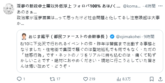 這樣的現象也讓不少當地人士感到不舒適,認為這些行為已經造成困擾,還要勞動警察來排解,連議會議員都在 X 上發文表示,這已經成為社會上的問題。在住宅區一群人聚在那邊吵鬧,這不是什麼「聖地巡禮」,只是單純的「擾民行為」