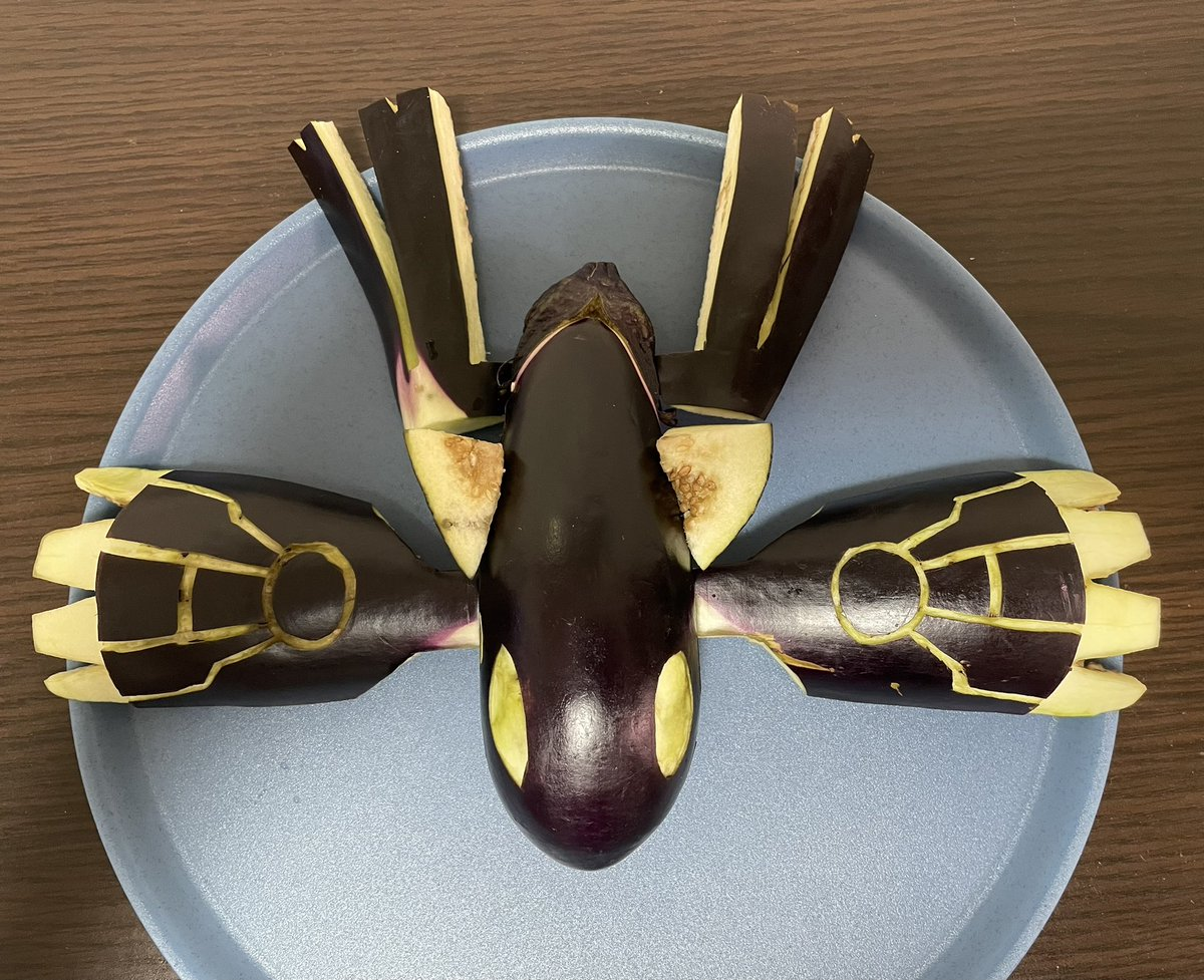 因為他拿的是茄子的關係,結果就把製作成異色「原始蓋歐卡」的模樣,氣勢看起來格外強大。巧合的是,今日日本滿多地方都在下雨,推主也表示,希望在大雨中,特地派了蓋歐卡出馬,確保祖先們能平安回來 XD。