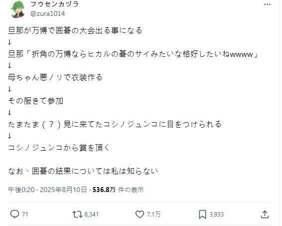 在2025年大阪世界博覽會,近日舉辦的「世界雙人圍棋嘉年華」( ペア碁ワールドフェスティバル ) 上,來自四國某縣的參賽選手意外成為全場焦點——不是因為棋藝,而是因為他一身《棋魂》的「藤原佐為」裝扮,成功奪下由世界級時尚設計師小筱順子( JUNKO KOSHINO )頒發的「最佳服裝獎」,趣味的經歷也引起網友關注。