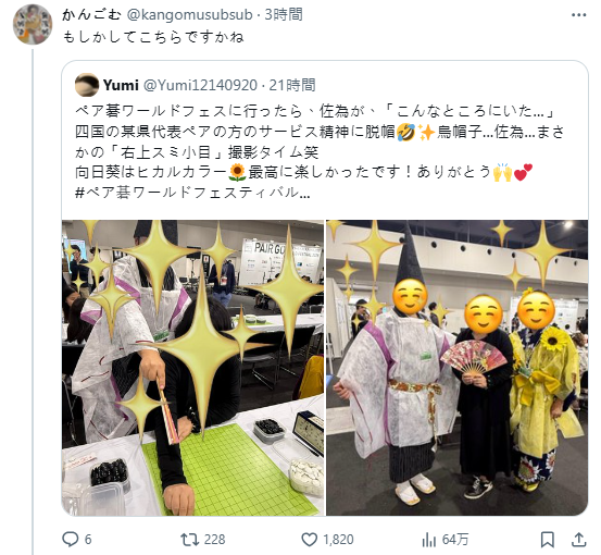 身為選手的太太在 X 分享,原本只是老公報名參加比賽,開玩笑說 : 「既然是在世博比賽,就想說打扮成《棋魂》的佐為」。沒想到婆婆聽了靈感大發,親手縫製了一套超還原的服裝。當天他穿著這套華麗的古風衣裳上場,恰巧被到場觀賽的名設計師小筱順子注意,最後直接頒獎給他。