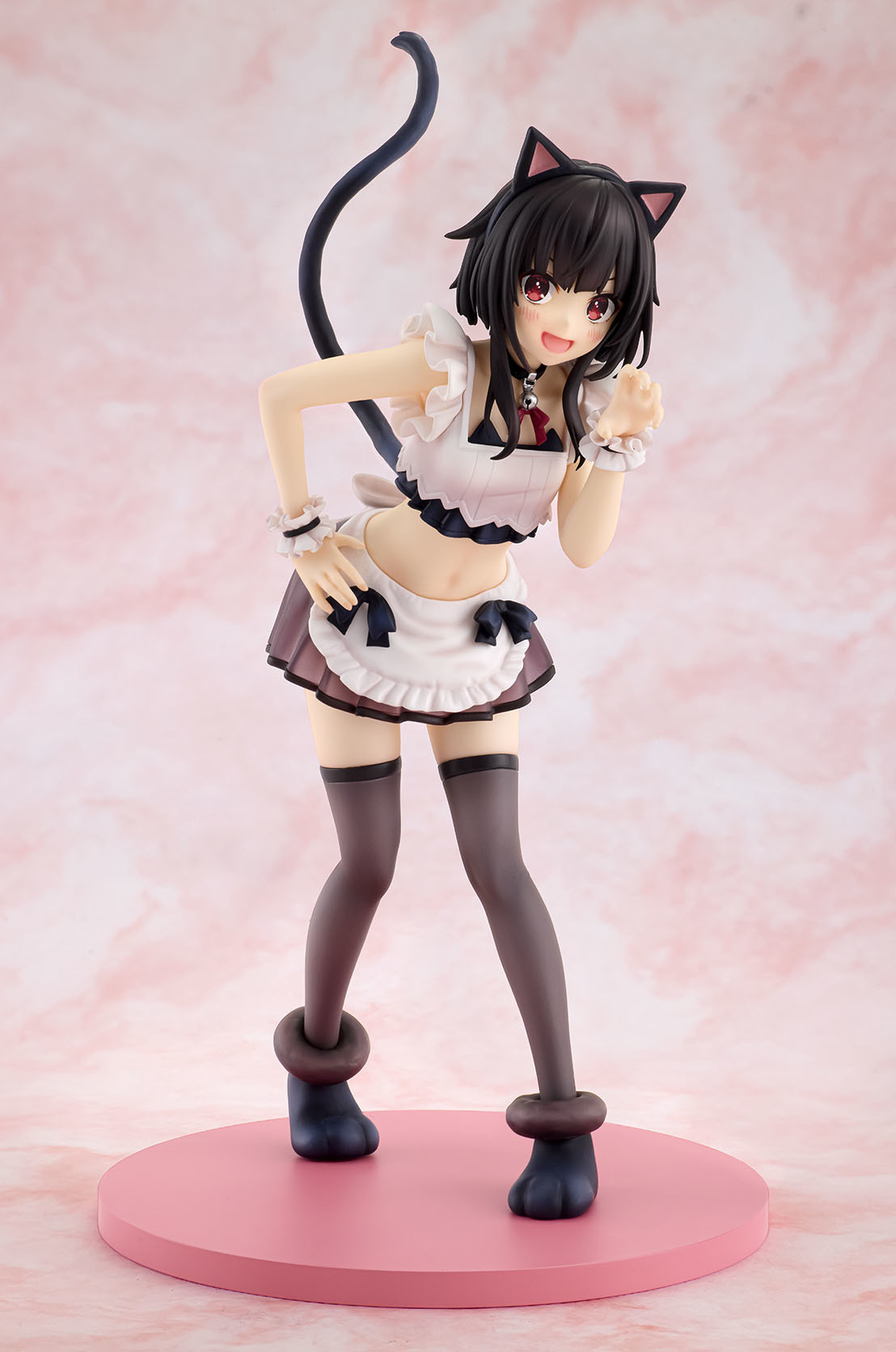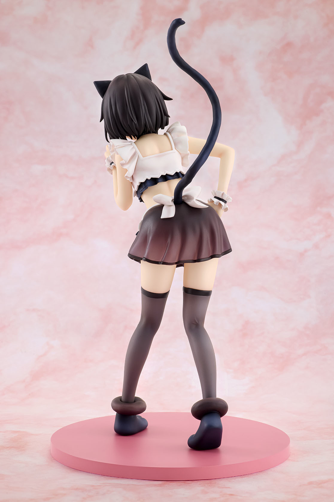 KDcolle「惠惠 原作版 貓耳女僕Ver.」無比例模型,以繪師三嶋黑音在抽籤堂(くじ引き堂)《為美好的世界獻上祝福!》10th anniversary 線上抽獎特別繪製的插畫為原圖,在約高 16 公分的尺寸中,將貓耳&尾巴造型的可愛惠惠立體化!擺出小貓咪般的俏皮姿勢,手指頭的細節相當生動;臉上調皮的表情與泛洪雙頰更是惹人疼~結合女僕裝的荷葉邊、蝴蝶結點綴,短裙採用透明材質打造,營造輕透感。抬得高高的尾巴與貓掌鞋子也是可愛到不行!