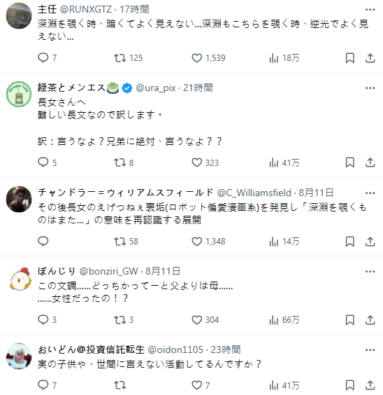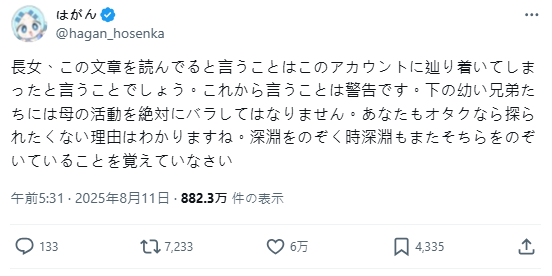 隨後,她在社群上發出「警告文」給長女,語氣嚴肅又帶點中二感:「若你正在讀這段文字,代表你已找到我的帳號。這是警告──不准把媽媽的活動告訴弟妹。你是御宅族,應該懂得不想被挖隱私的心情。記住,當你凝視深淵時,深淵也在凝視你。」