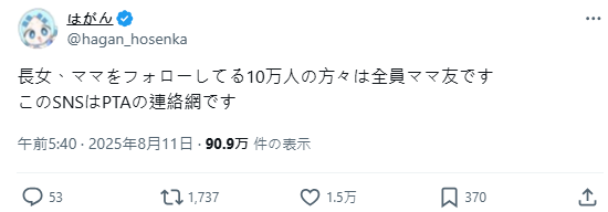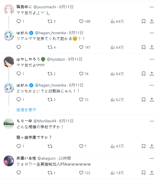 眼看事件發酵,「はがん」立刻啟動「媽媽友偽裝計畫」,宣稱「追蹤媽媽的10萬人都是媽媽友,這是PTA的聯絡網」。大量網友紛紛回覆「我是媽媽友」、「我是媽媽友叔叔」,甚至有人搞笑稱她是「全日本PTA會長」。