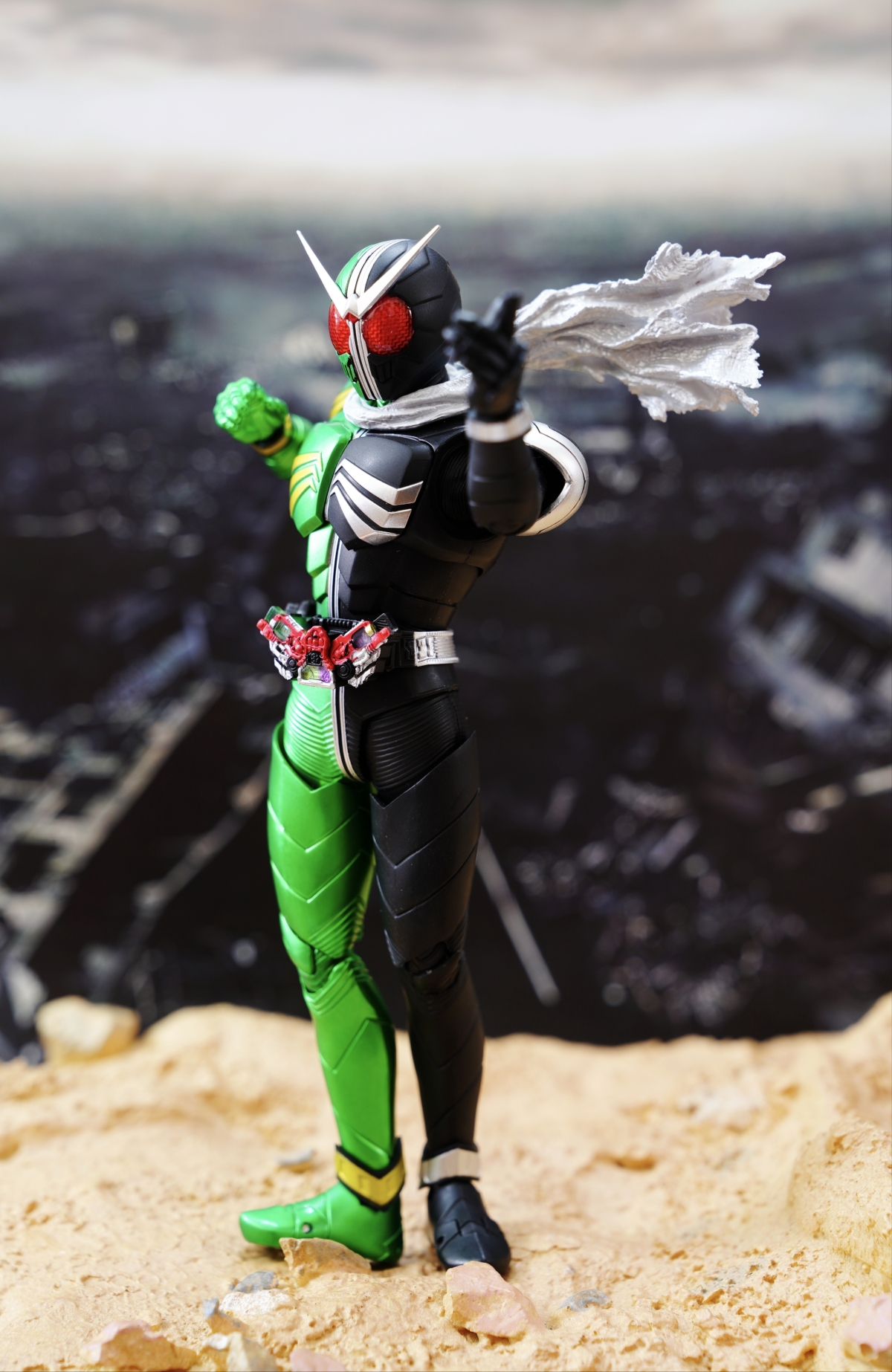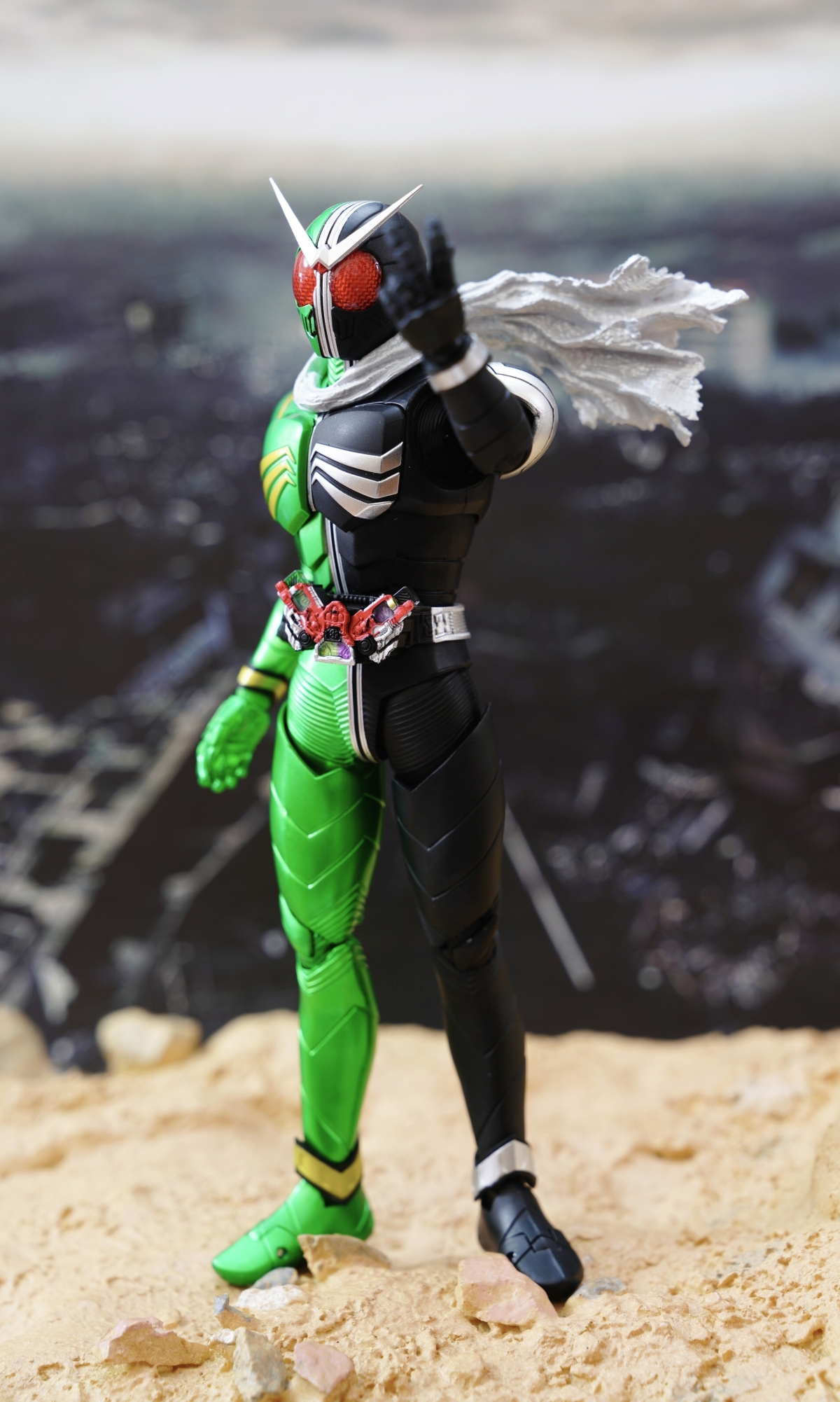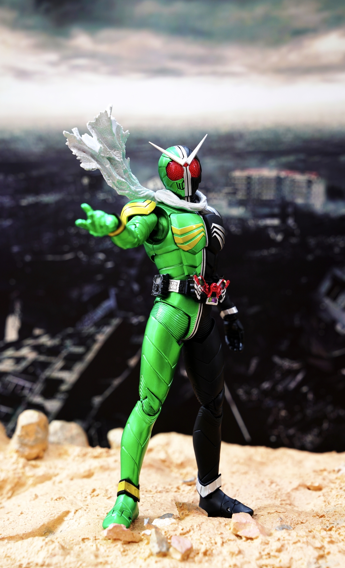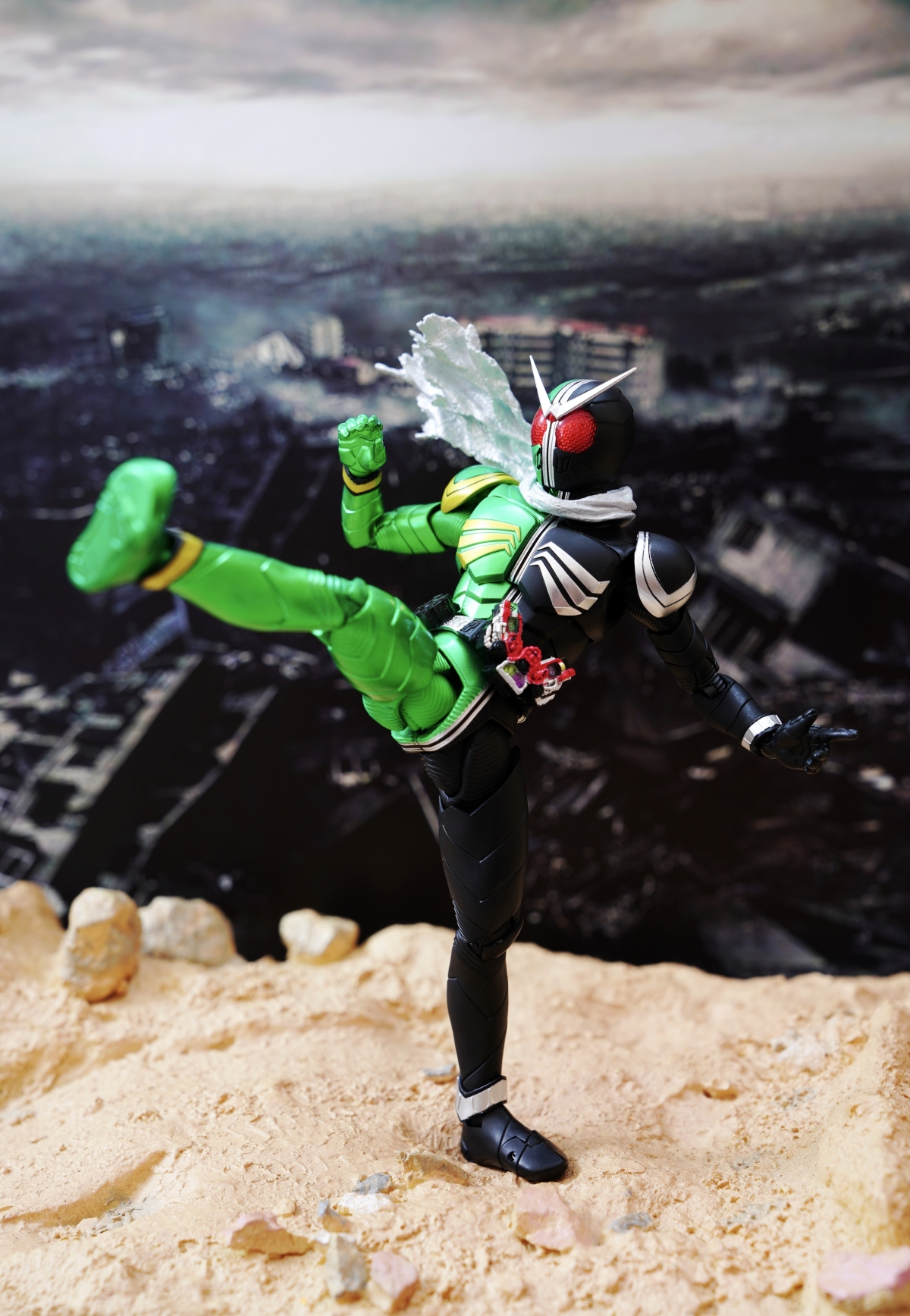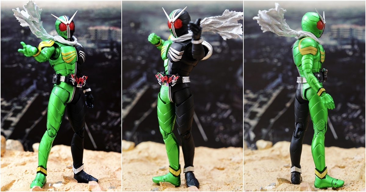 配件則有 7 對替換用造型手掌、飄動狀態替換領巾零件、專用武器「骷髏麥格農槍」、旋風記憶體、骷髏記憶體,變身腰帶「W DRIVER」具備展開狀態可動機構並能裝填記憶體零件。配件不多,故可玩性一般。真骨彫的可動性不會太差。鬆緊度適中,單腳站立也不成問題。搭配本體出色的可動關節設計,就能把玩出帥氣的戰鬥姿態!QC,上色及塗裝很好(難得)。當然,他最大賣點是其完美的外型吧。
