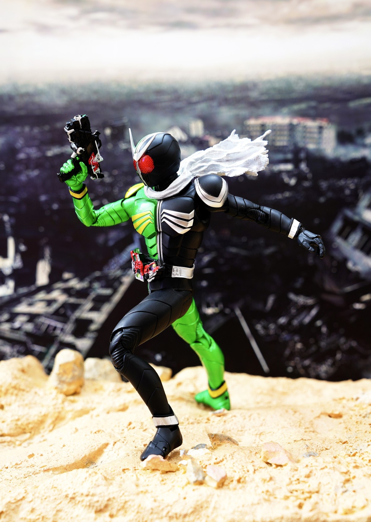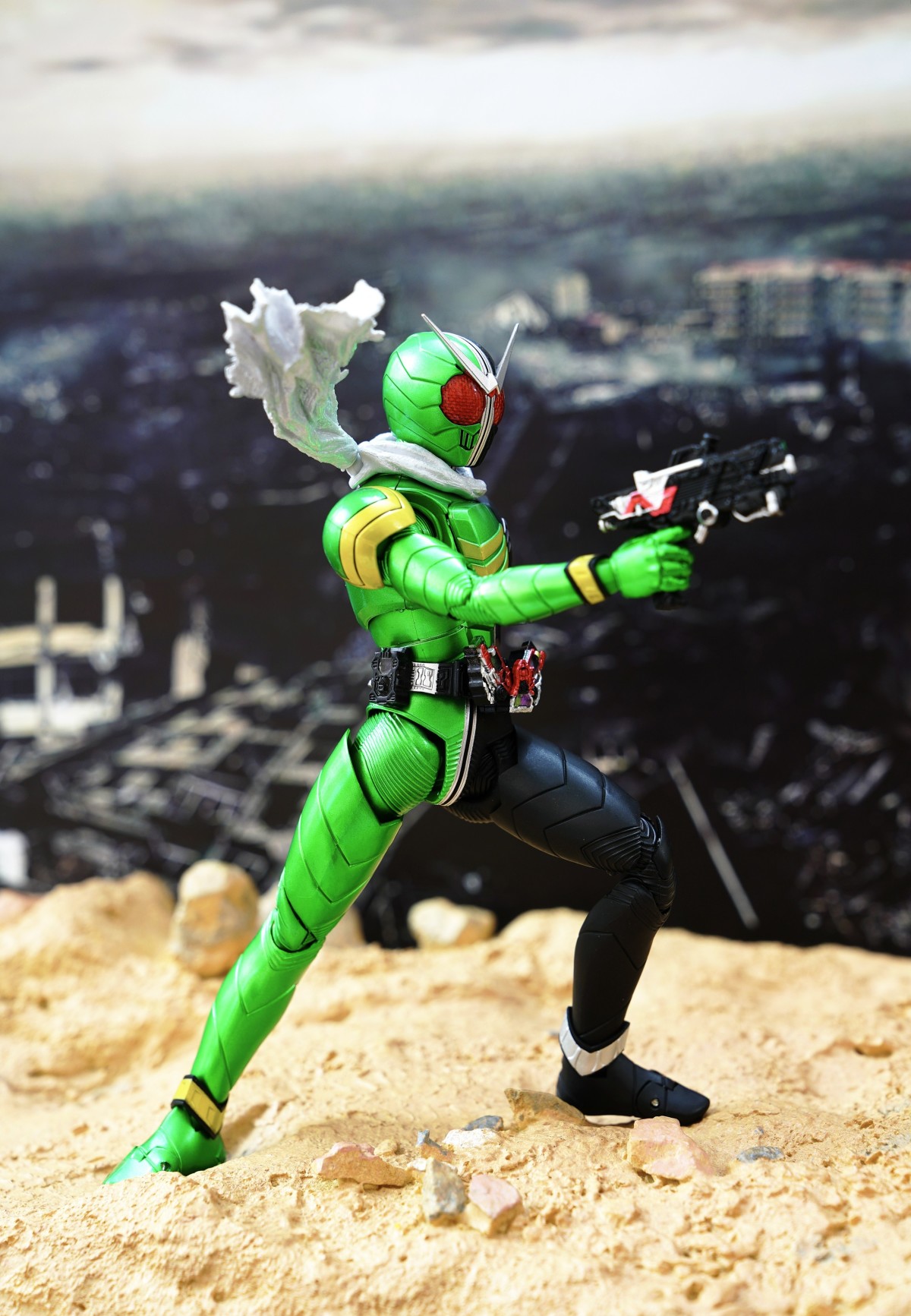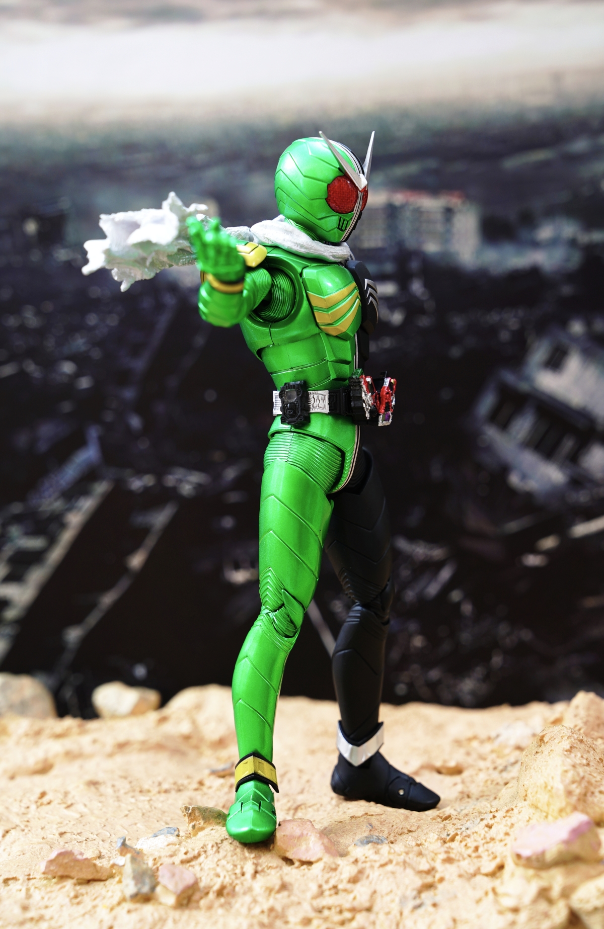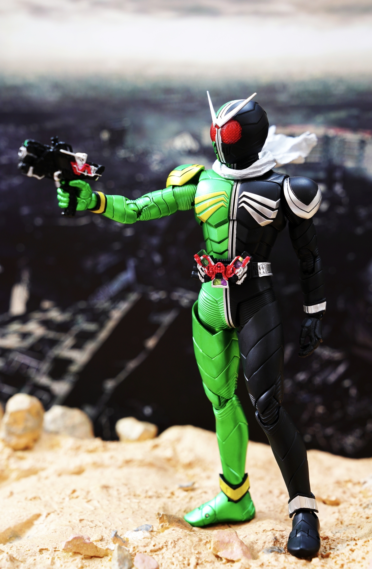 配件則有 7 對替換用造型手掌、飄動狀態替換領巾零件、專用武器「骷髏麥格農槍」、旋風記憶體、骷髏記憶體,變身腰帶「W DRIVER」具備展開狀態可動機構並能裝填記憶體零件。配件不多,故可玩性一般。真骨彫的可動性不會太差。鬆緊度適中,單腳站立也不成問題。搭配本體出色的可動關節設計,就能把玩出帥氣的戰鬥姿態!QC,上色及塗裝很好(難得)。當然,他最大賣點是其完美的外型吧。