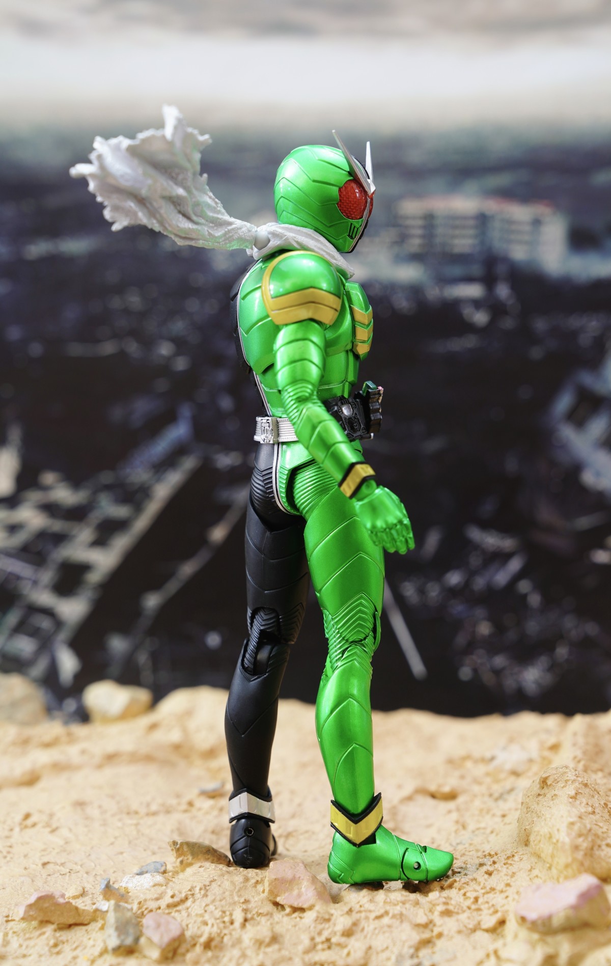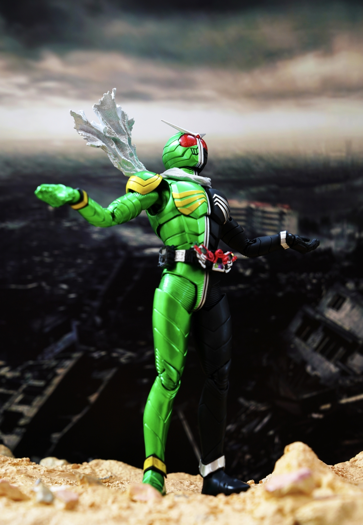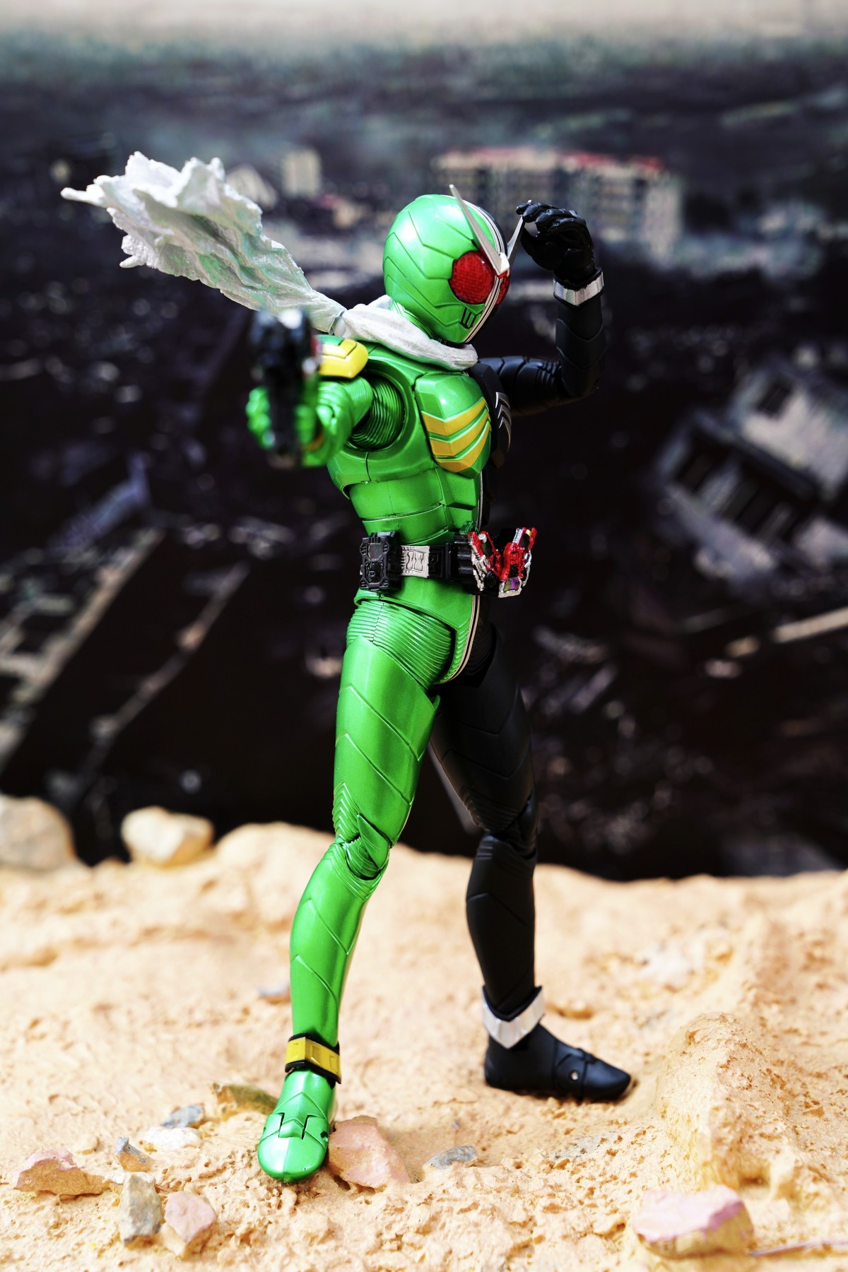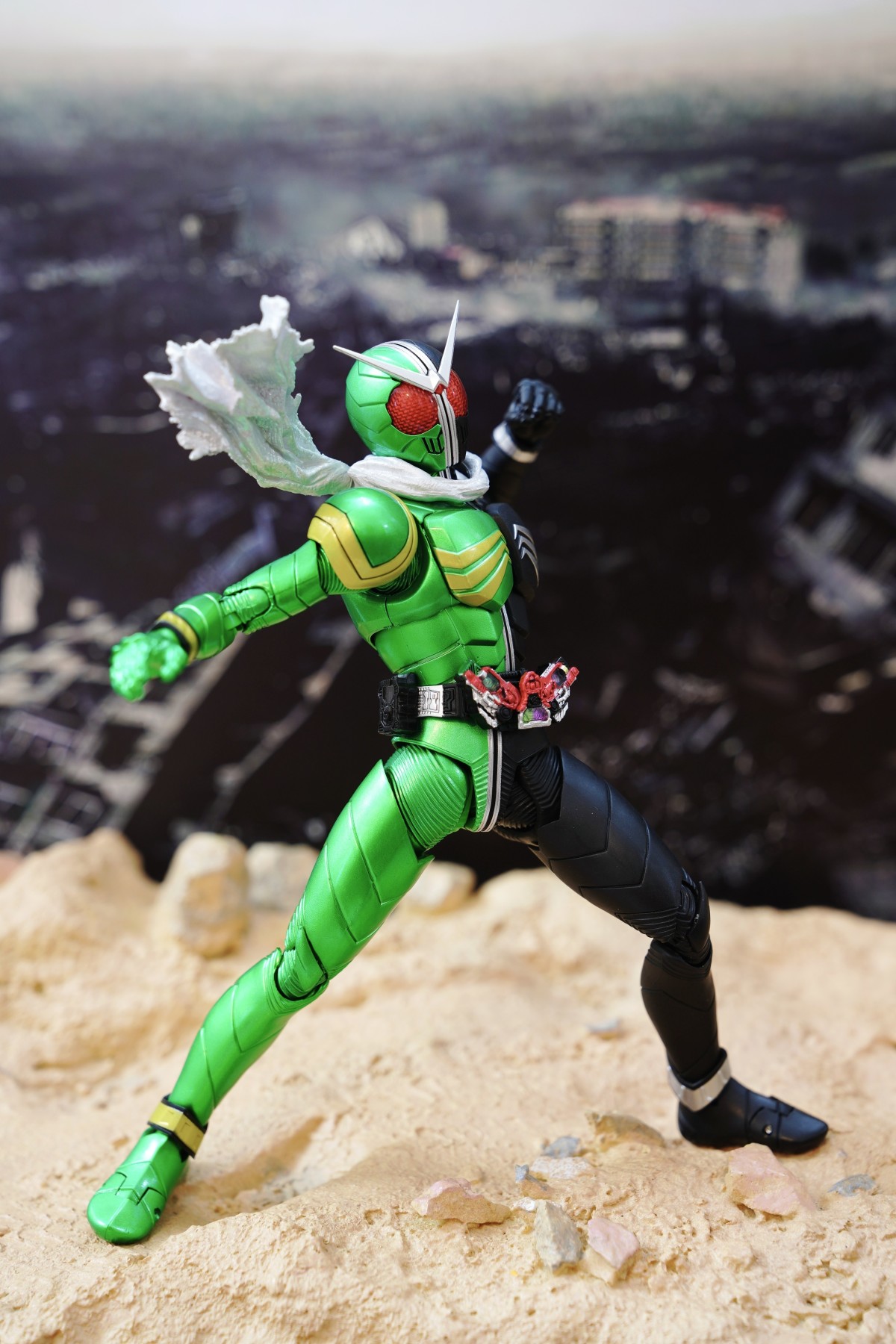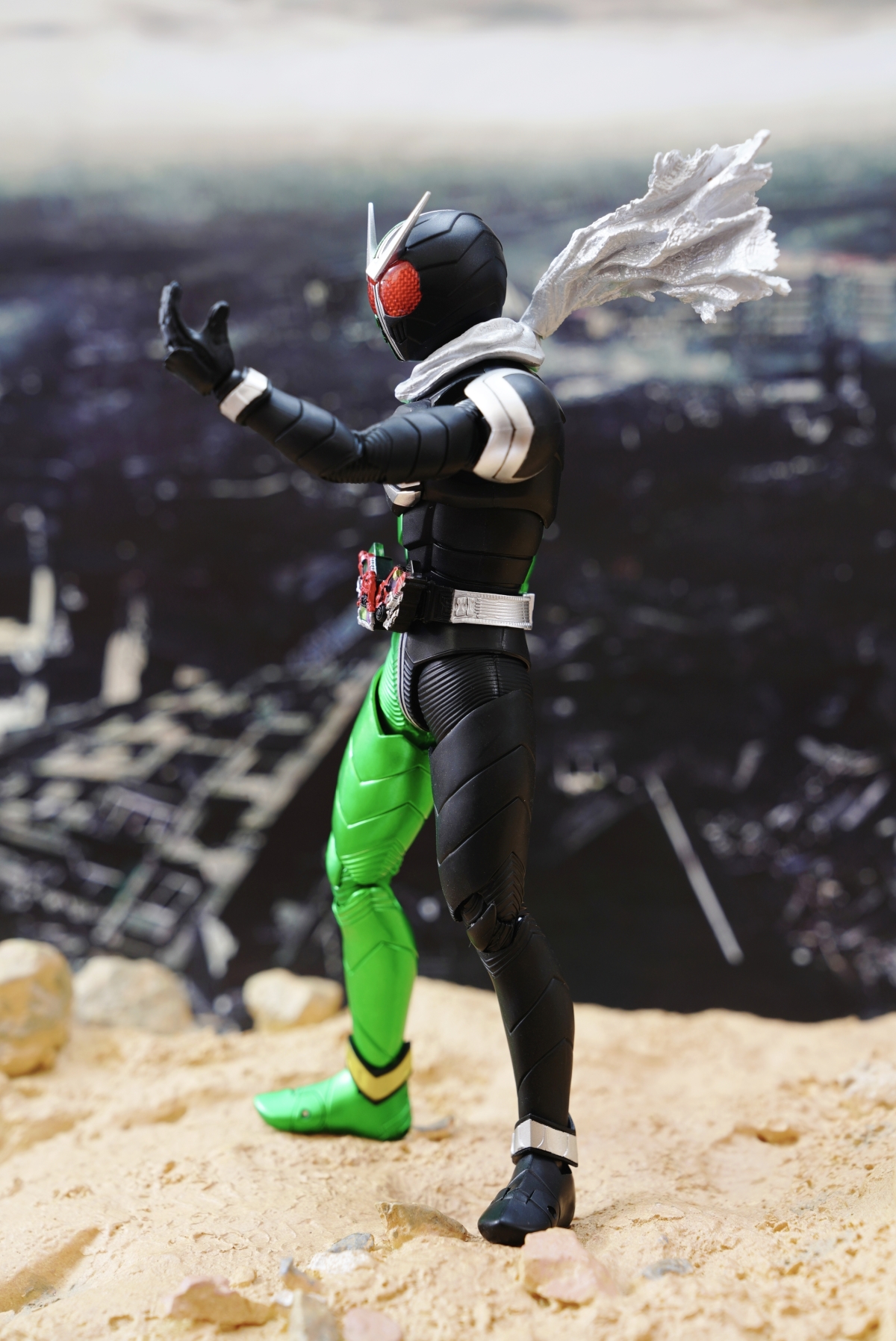 配件則有 7 對替換用造型手掌、飄動狀態替換領巾零件、專用武器「骷髏麥格農槍」、旋風記憶體、骷髏記憶體,變身腰帶「W DRIVER」具備展開狀態可動機構並能裝填記憶體零件。配件不多,故可玩性一般。真骨彫的可動性不會太差。鬆緊度適中,單腳站立也不成問題。搭配本體出色的可動關節設計,就能把玩出帥氣的戰鬥姿態!QC,上色及塗裝很好(難得)。當然,他最大賣點是其完美的外型吧。