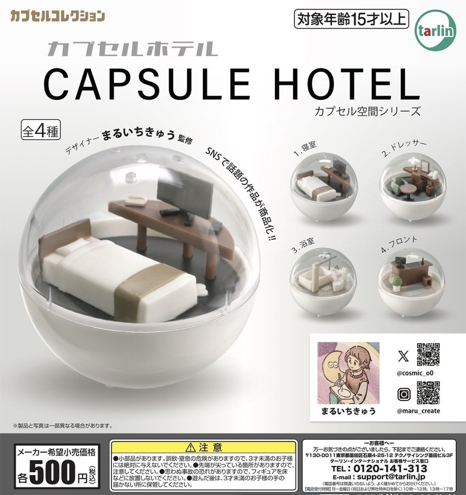 日本玩具品牌 TARLIN 國際(ターリン・インターナショナル)攜手日本設計師 まるいちきゅう(@cosmic_o0),要在本(8)月推出一套很有意思的轉蛋玩具「轉蛋旅館」(暫譯,カプセルホテル)!建議售價為每轉 500 日幣,一共有四種款式可以收集。