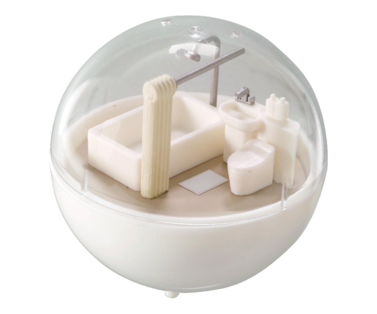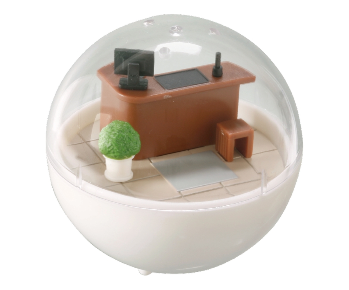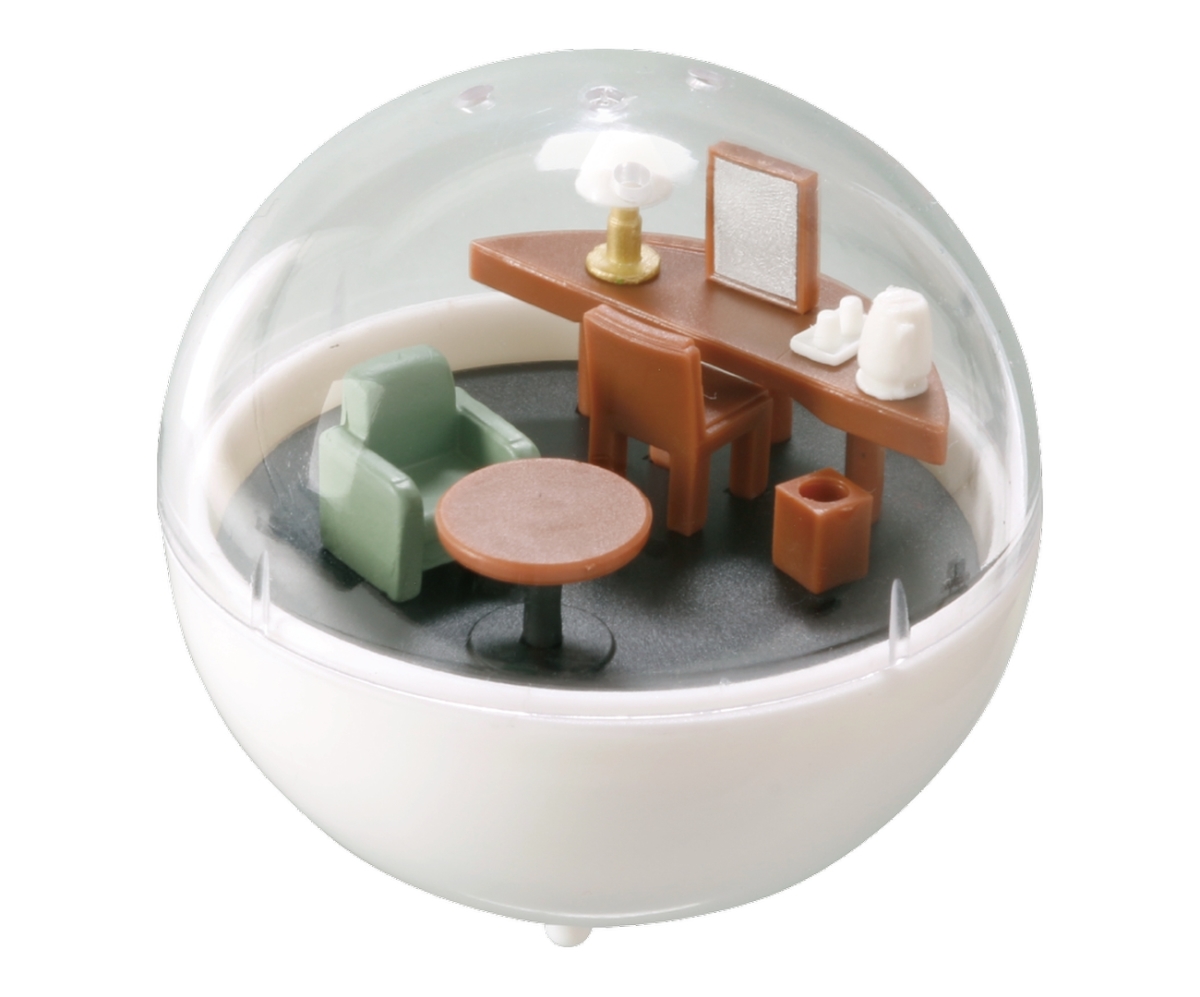本次由 tarlin 製作發行、まるいちきゅう 監修的「轉蛋旅館」一共有四種款式,包含「臥室」、「化妝台」、「浴室」跟「櫃檯」,在每一個圓形轉蛋殼內部仔細放入各式各樣的豐富傢俱跟物品,傳達出一種「雖然很小但好像蠻舒適」的視覺效果;同時也與 まるいちきゅう 學生時代作品注重每款作品獨立性的設計風格做出差異,這次的轉蛋更加注重各個空間的內部豐富度,在具備獨立展示也 OK 的前提下,實現買越多越好玩的銷售策略,狂轉一波就能組出一間複合球體旅館,頗具未來感。