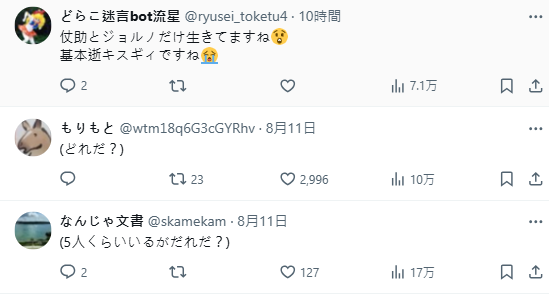 貼文底下的回覆各種腦補,有人問「到底是哪個 JoJo?」、「有五六個人都叫JoJo吧?」甚至有人笑稱:「這部作品裡死過的 JoJo 不只一個,還有人死了又回來」,還有人開賭盤到底是哪一個 JoJo 掛了讓他如此驚訝 XD。