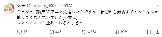 繪師「玄米」表示,是在補完《JoJo》第一部後發表這番感想,形容「從頭到尾都在打架」、「最終BOSS比蟑螂還耐打」,但會繼續看下去後面幾部。