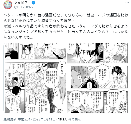 其中有推主重新去翻了一下《爆漫王》,覺得《爆漫王》真的「很舊時代」的,是新妻惠一兒那段「為了不讓他的漫畫結束而搞人氣投票對決」的劇情。