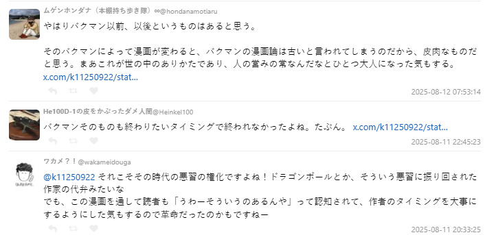 當然這些觀點都是網友的主觀意見,或許《爆漫王》也非漫畫業界改變對作品態度的原因,不過或許回頭看《爆漫王》劇情中那種漫畫比拚,新妻惠一兒喊出的「如果我成為JUMP最有人氣的作家,就給我能讓『我討厭的漫畫』完結的權利。」,這些話語也有不同的感覺吧。