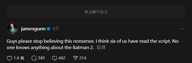 對此,岡恩在社群平台 Threads 上發文回應:「各位,請別再相信這種無稽之談。我想只有我們六個人讀過劇本。沒有人知道《蝙蝠俠2》的任何細節。」他明確否認外界對角色設定的猜測,並強調劇情細節高度保密。