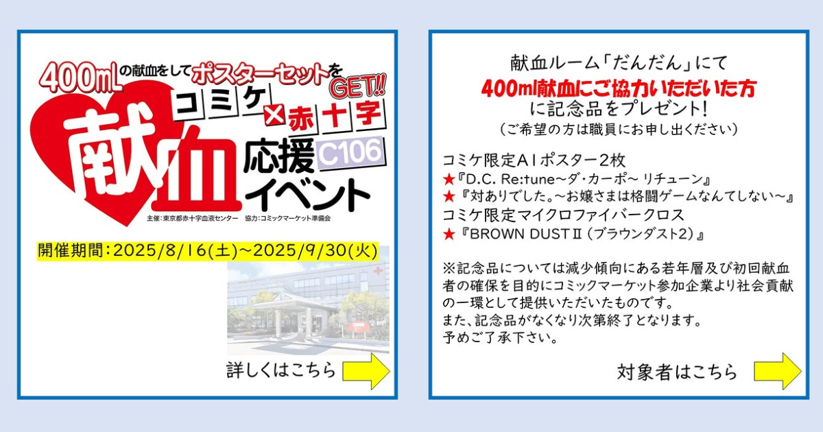 會有這樣的思考,是因為像是日本最大同人場 Comiket 就屢屢跟日本紅十字會合作,每次活動都出動數台捐血車在會場邊待命希望大家來提供血庫,也提供相關贈品讓大家願意捐血。