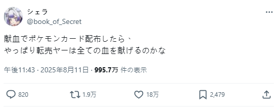 近日有日本網友突發奇想,在 X 發文表示:「如果捐血就能拿到寶可夢卡片,黃牛是不是會拼命把血都捐出來?」,這一舉兩得的思維,也引起不少網友討論可行性。