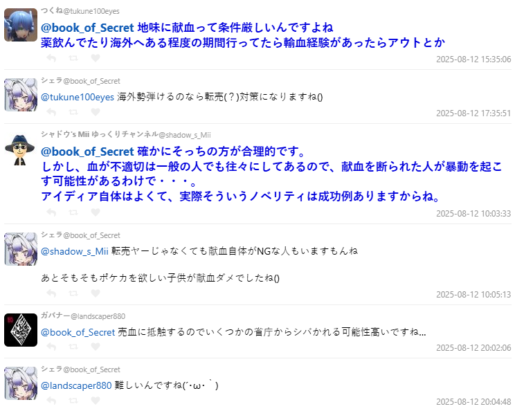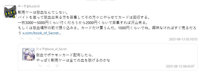 針對原 PO 認為「黃牛會拼命捐血」的猜測,有網友直言:「黃牛自己不會去捐,他們會花錢找人代捐,或直接在捐血站外收卡片。」由於寶可夢卡市場價值動輒數千日圓,黃牛只要花一、兩千元找人,就能穩賺不賠。