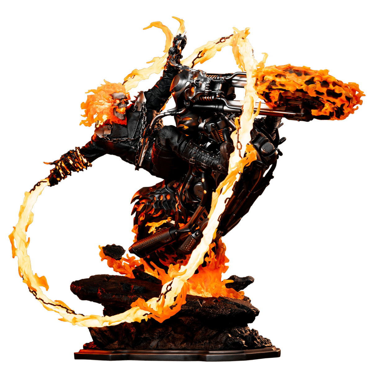 本次以驚人大比例立體化、全高來到 91 公分的「惡靈騎士」雕像是根據格鬥手遊《MARVEL超級爭霸戰》(Marvel Contest of Champions)的設定製作,打造出強尼·布雷茲(Johnny Blaze)騎在高高翹起前輪的地獄機車上、揮舞鐵鍊的魄力姿態。從強尼的頭部、鎖鏈,到機車的輪胎全都燃燒著熊熊烈火,強尼身穿的黑色皮衣、皮褲、長靴展現出逼真質地,加上採用金屬零件製作的鎖鏈、融入骷髏元素的機車零件,整體從造型到材質都散發沈重的威壓感。