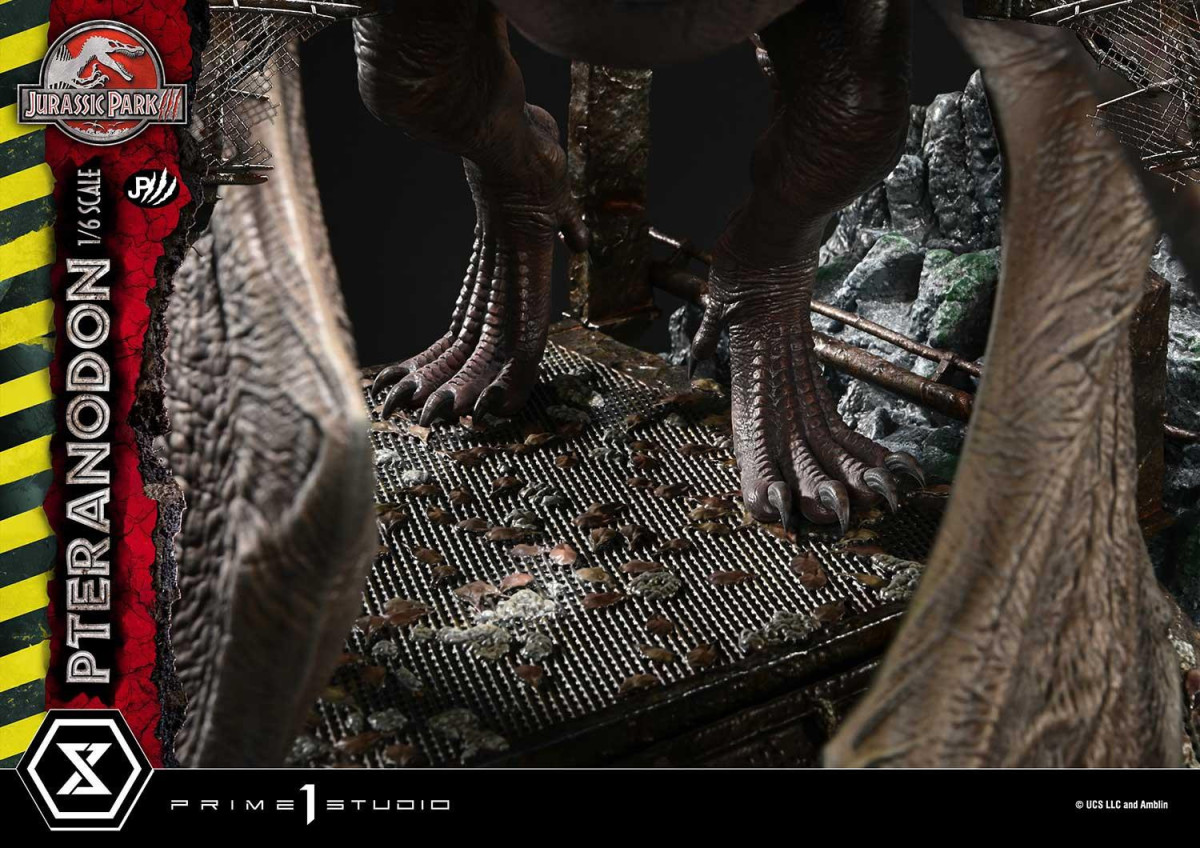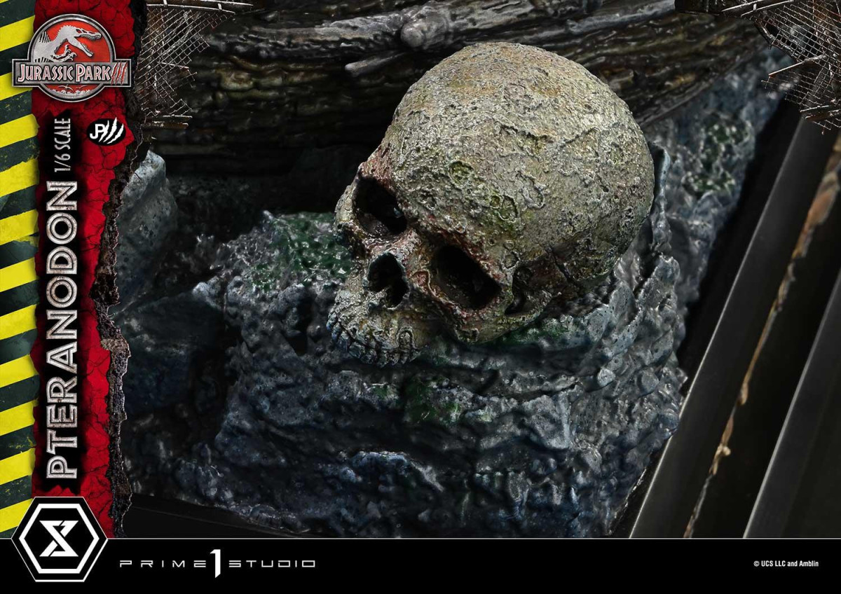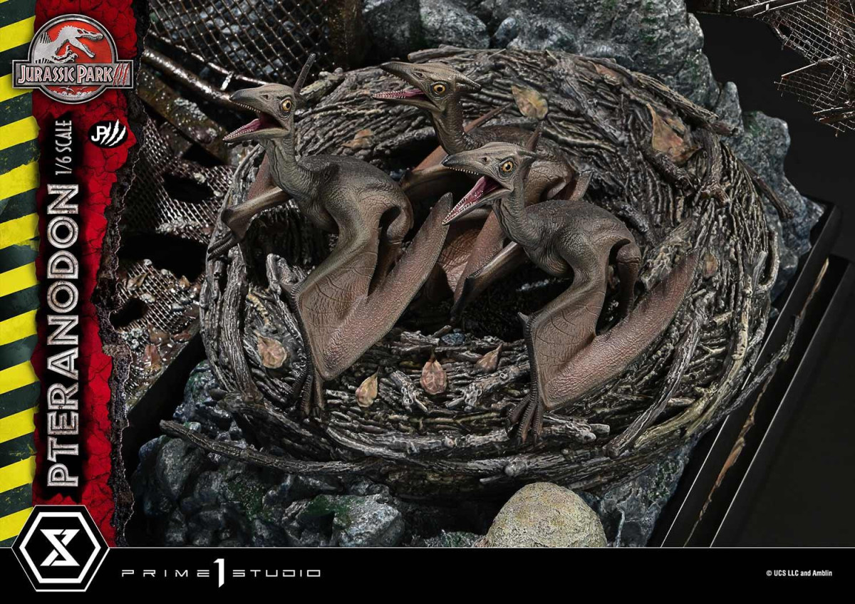 在《侏羅紀公園III》電影中,無齒翼龍不僅把保羅與亞曼達的兒子艾瑞克叼走、丟回巢中餵養自己的翼龍寶寶,以巨大身影步步進逼亞倫·葛蘭特博士一行人的場面相信也令人印象深刻。本次 Prime 1 Studio 不僅打造出無齒翼龍,連被牠當成巢的殘破「鳥籠」設施跟翼龍寶寶們也一併立體化。高約 68 公分、長度則有 74 公分,除了充分表現鳥籠毀壞的殘骸之外,無齒翼龍銳利的頭部、雙翼翼膜、經過收縮的背部肌肉都生動描繪,劇中被艾瑞克拿來丟向翼龍寶寶們的頭骨也好端端的放在那(笑)。