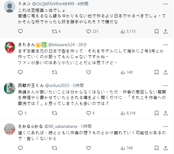 多數粉絲則認為,因為鳥山明已經過世了才出現在這個海外企劃,大家只希望這件事情是鳥山明自己也期望且認可的東西,當然大家也希望能蓋在日本,畢竟《七龍珠》就是日本孕育出的巨作。