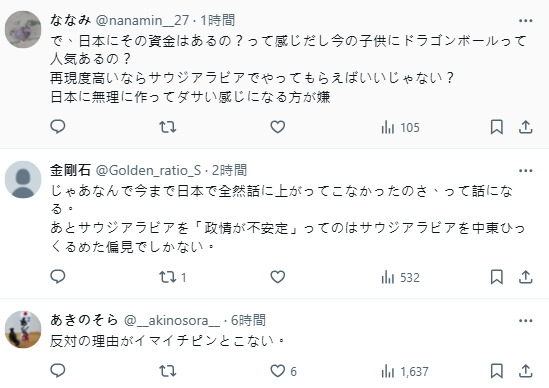 不過也有網友認為,日本就是沒有資金,且所謂支持七龍珠的讀者都已經長大了,大人要掏錢出國去玩也非難事。所謂「因為日本小孩去不了」而反對根本不是理由,且如果在日本想蓋出這樣的規模的設施,最後可能只會淪為笑柄而已。