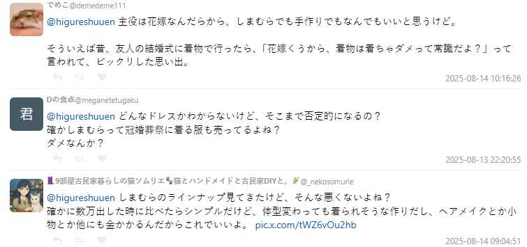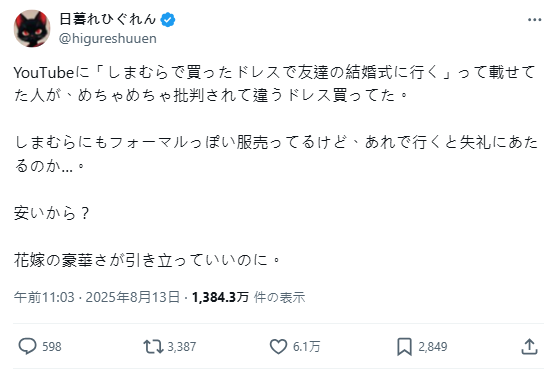 有推主就在看到影片之後,詢問 X 上網友的意見,認為「穿在思夢樂買的洋裝去朋友婚禮」居然被遭到批評,思夢樂也有賣看起來偏正式的服裝,為什麼穿去婚禮會被認為失禮?是因為便宜嗎?發文的人甚至覺得反而可以襯托新娘的華麗。