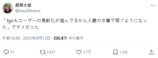 對於「FGO 靠人妻泳裝賺錢」的玩笑說法,有玩家分析,遊戲推出已近十年,玩家群體的年齡層確實逐漸提高,「當年還沒 20 入坑的,現在都快30了」,因此會有這種市場反應也不奇怪。